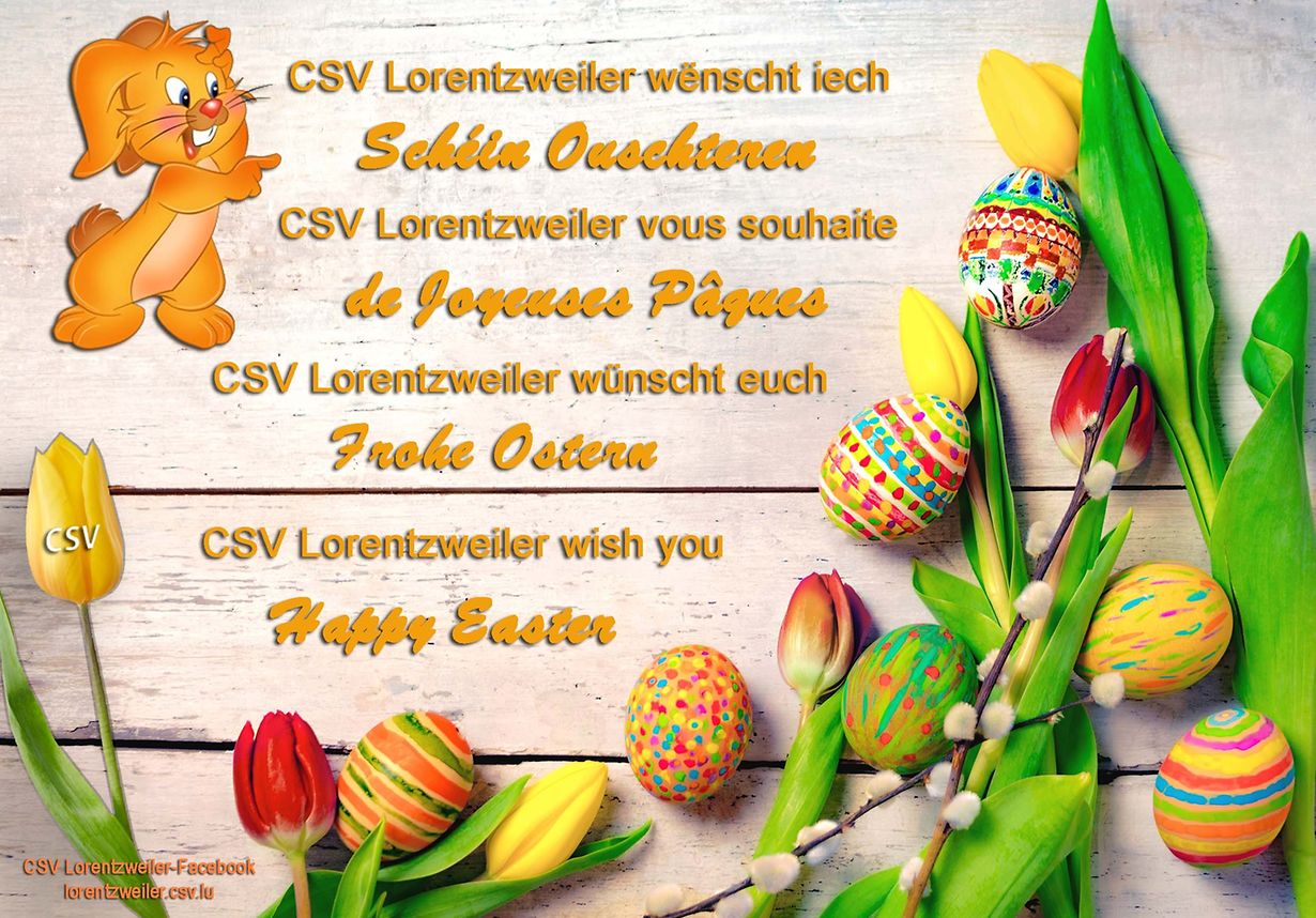 Lorentzweiler Schein Ouschteren. Reeff Marcel Publié le mercredi 31 mars 2021 à 10:26 Lorentzweiler, Luxemburg D'CSV Sektioun vun Lorentzweiler wënscht Iech all schein Ouschteren. Signaler contenu inapproprié Plus de nouvelles de Reeff Marcel > Faire le plein d'activités 27/07/25 Walferdange Moments.... 17/04/24 Lorentzweiler Belschplage 10/02/23 Lorentzweiler Owes Himmel zu Hielem. 03/10/22 Lorentzweiler Tournesol..... 30/08/22 Lorentzweiler