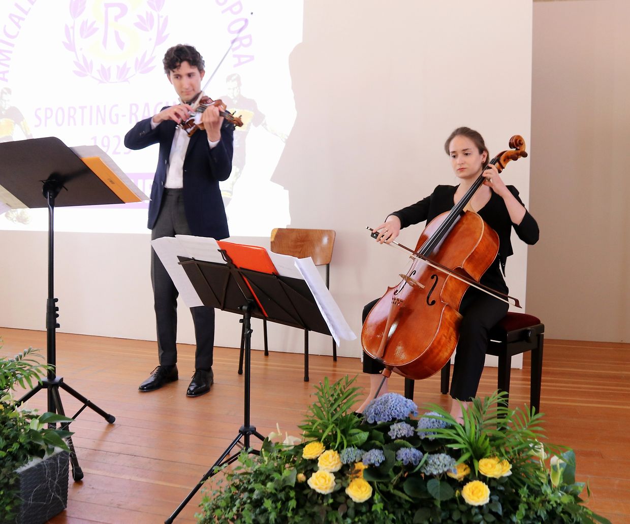 Die Feiere wurde von dem Streicherduo Nora Braun und Const. Riccardi musikalisch verschönert. Unter anderem spielten sie den Spora’s Marsch von Nikki Kirsch. Dann präsentierten Roger Medernach und John Stammet ein Video aus der Vereinsgeschichte mit Interviews ehemaliger Spora-Größen und mit Filmen Mitschnitten aus internationalen Fußballspielen. Auch wurde das Erinnerungsalbum „Et Wor Emol“ vorgestellt. Pierre Mousel via mywort