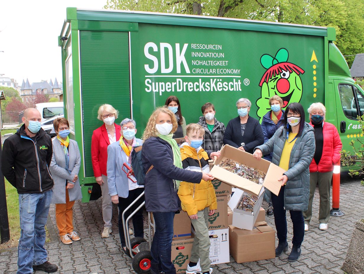 2.211 Brillen, das sind 178 Kilogramm. Am 6. Mai 2021 wurden die Brillen an Petra Biwersi, Mitarbeiterin der SuperDrecksKëscht (SDK), übergeben.