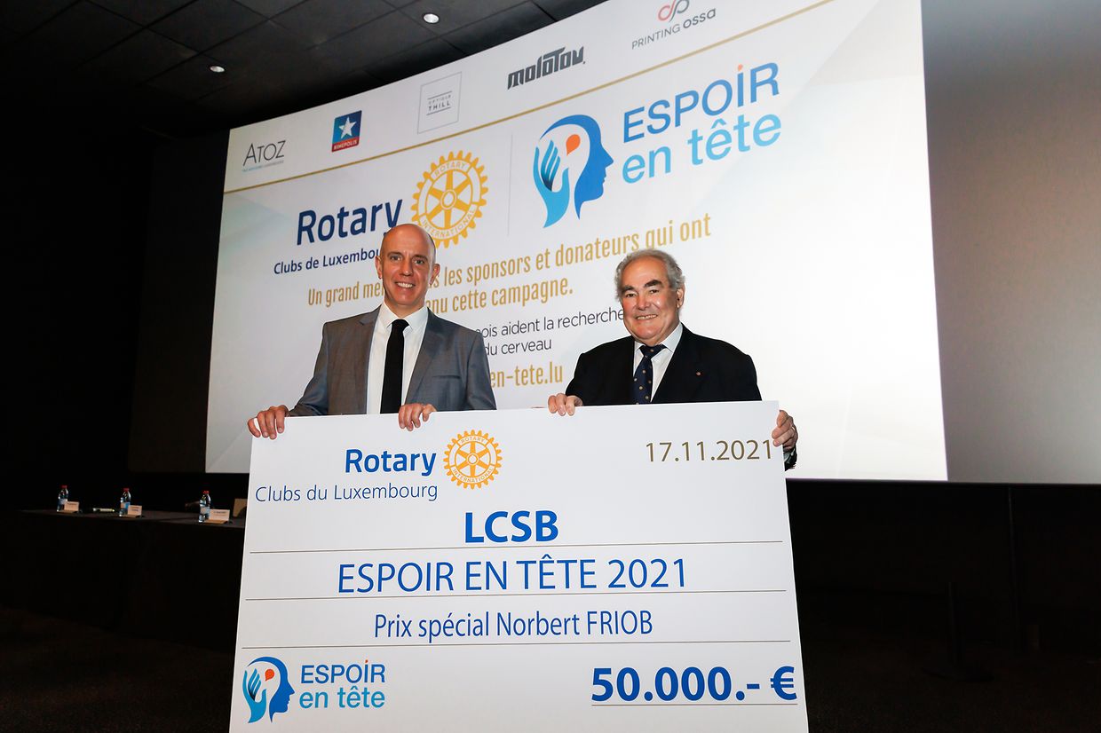 Les membres des Rotary Clubs luxembourgeois tiennent tout particulièrement à remercier Norbert Friob, Gouverneur du District 1630 des Rotary Clubs en 2013/2014 et l’un des initiateurs du projet « Espoir en tête » au Luxembourg. Son précieux soutien a notamment permis de créer un nouveau prix spécial baptisé « Espoir en tête – Prix Norbert Friob », attribué dans le cadre de cette année exceptionnelle au projet dirigé par le professeur Dr. Paul Wilmes.