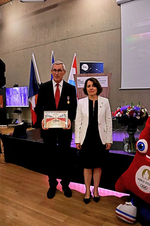Dans le cadre des festivités pour le 14 Juillet l’ambassadrice de France, S.E. Mme Claire Lignières-Counathe a remis, lors d’une réception donnée au Lycée Vauban, à Edmond Faber la médaille en vermeil de la Fédération nationale des porte-drapeau de France.