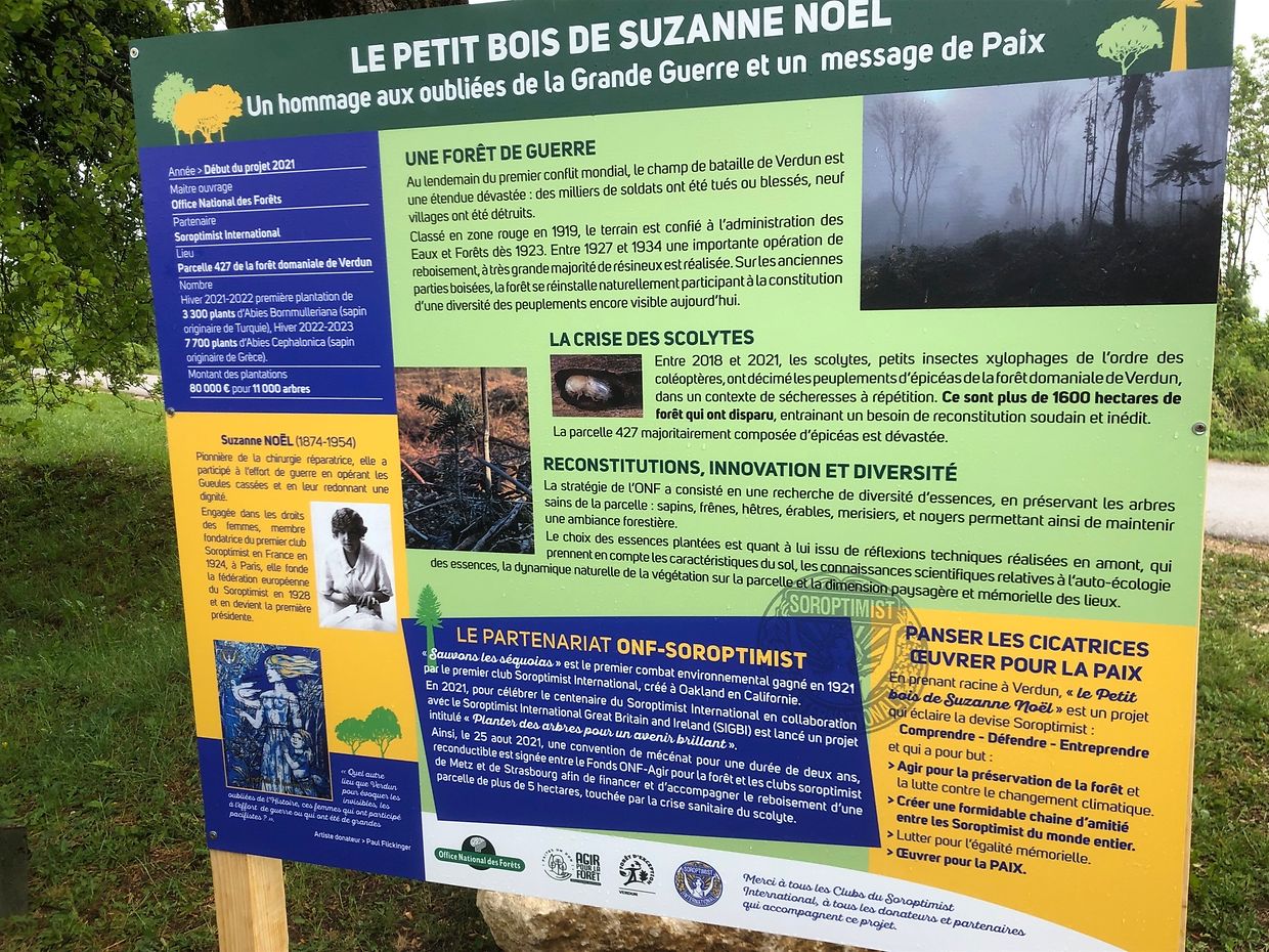 Le club Luxembourg-Doyen du Soroptimist International continue à soutenir un projet international de paix, de protection environnemental et de commémoration, "le petit bois de Suzanne Noël". Une chèque de 3000€ fut remise à la présidente de son club-soeur Metz pour planter 300 sapins tout près des cimetières de guerre à Verdun. Un projet d'envergure qui marque le centenaire du Soroptimisme (1921-2021) et vise à planter 11 000 sapins remplaçant les épicéas morts de scolyte. Le bois porte le nom du docteur célèbre Suzanne Noël, chirurgien réparatrice de soldats mutilés pendant la Grande Guerre et fondatrice de la branche européenne du Soroptimist International. Le bois se développe: il reste encore 1 400 arbres de paix à planter. Avis aux donateurs!
