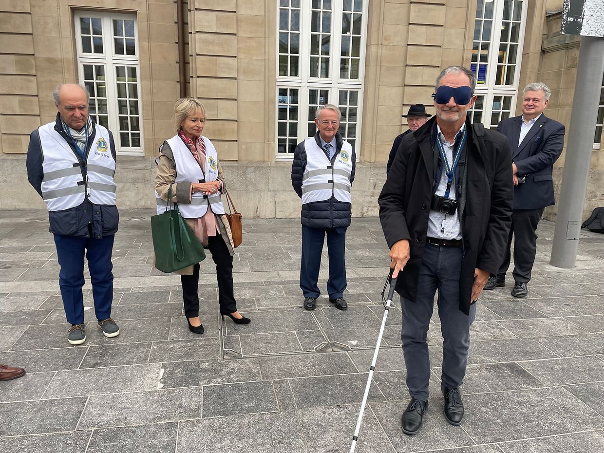 En cette Journée mondiale de la Canne Blanche du 15 octobre 2022, le comité de pilotage du Jumelage Lions entre les Districts Lions Ile de France Paris et Luxembourg tout comme la Commission Lions SightFirst avaient convié à la galerie de la Gare Centrale de Luxembourg à un événement promotionnel unique de présentation du dernier modèle de l’appareil « Rango » par la société GoSense de Lyon. L’Association pour Mal Voyants et Aveugles du Luxembourg (AMVA) était représentée par leur présidente Pascale Link et deux de leurs membres qui ont testé et évalué le fonctionnement de cet équipement ultra performant. En même temps, le hall de la Gare prêtait le cadre à une initiative spontanée de sensibilisation et d’initiation de personnes voyantes à l’utilisation d’une canne blanche à l’aveuglette sous bandeau, mise gracieusement à la disposition par la Fondation Lëtzebuerger Blannevereenegung.