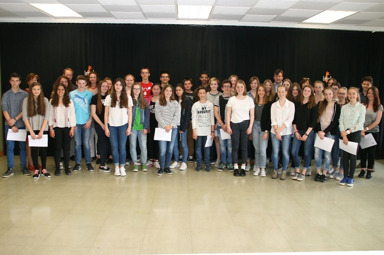 Anlässlich der Preisverleihung wurden die jungen Leseratten gebührend ausgezeichnet. Rund 40 Schüler (siehe Foto), die sich als besonders aufmerksame Leser hervorgetan hatten, gewannen den Hauptpreis, einen Tagesausflug nach Köln. Herausragend war vor allem die Leistung von Drago Dragovic (2C2), der in sämtlichen fünf Sprachen antrat und mit präzisen Kenntnissen über gleich zehn (!) Bücher zu glänzen wusste.