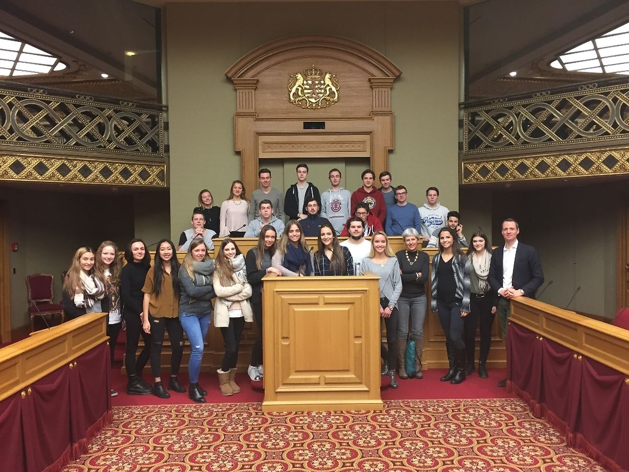 Le mercredi 25 janvier 2017, les élèves de la classe 2G1 ont eu l’opportunité d’assister à une visite guidée de la Chambre des députés, suivie d’une discussion animée dans la salle d’assemblée. Ils étaient accompagnés par Mme Françoise Wolter (instruction civique) et M. Tom Hübner (français) qui ont intégré cette visite au programme de leur branche respective.