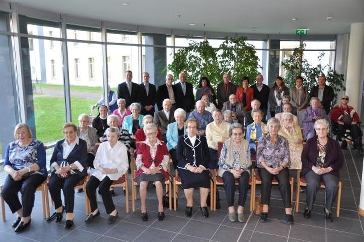 Als Gratulanten hatten sich neben Oberin Sr. Paule Detampel, Nicky Wintringer und Michael Hillmer von der Heimleitung, Christiane Haubrich-Schandeler, Romain Beringer und Henri Krier als Vertreter der Gemeinde Mersch, Georges Herr (Lintgen), Christiane Eicher-Karier (Tüntingen), Nico Dhamen (Fels), Marianne Brosius-Kolber (Fischbach) Jacqueline Majeres (Colmar-Berg), Albert Lentz, Präsident der Amiperas Sektion Mersch, sowie Jubilare aus dem Blindenheim eingefunden. Gefeiert wurden folgende Geburtstagskinder: Alphonse Simon (70 Jahre), Catherine Krier (76), Josée Frieseisen-Henico (76), Alice Molitor-Heinen (79), Clement Bisenius (79), Maria Pletschette (80), Maria Brosius-Lehnerts (81), Marie-Louise Freymann-Seiler (81), Sr. Pierre-Marie Schmit (82), Catherine Kayser-Walin (82), Maria Heuts-Kruijen (82), Cécile Treinen-Welschinger (83), Madeleine Louis (83), Madeleine Hoffmann-Barnig (84), Amélie Ewen-Frisch (84), Margot Paler-Hansen (85), Clementine Hoffmann-Heffenisch (85), Justine Raach-Klein (86), Alphonse Wiseler (87), Jos Kraus (87), Jeanette Schneider (88), Anna Bodeving-Kerger (88), Pierre Boentges (88), Mathilde Flies-Bisenius (88), Anne Feidt-Ries (88), Alice Losch-Haan (90), Jos Molitor (91) und Alice Baustert-Wolter (96). (rfg) (FOTO: C. MULLER)