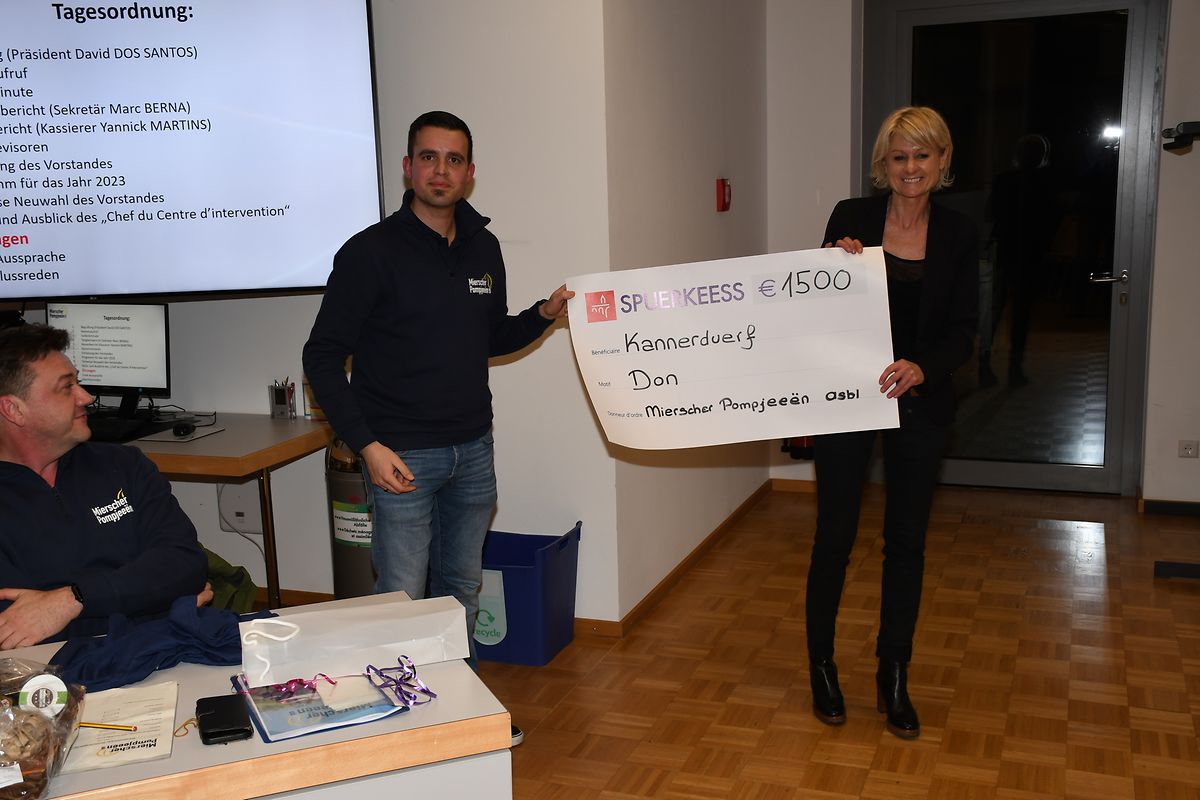 Seit einigen Jahren überreichen die „Mierscher Pompjeeën asbl “ jedes Jahr einen Scheck an eine karitative oder soziale Einrichtung. Dieses Jahr ging der Scheck in der Höhe von 1500 Euro an das „Mierscher Kannerduerf“. Frau JACOBY vom Kannerduerf erklärte, dass das Geld für ein Projekt im Rahmen der Erlebnispädagogik verwendet werden würde.