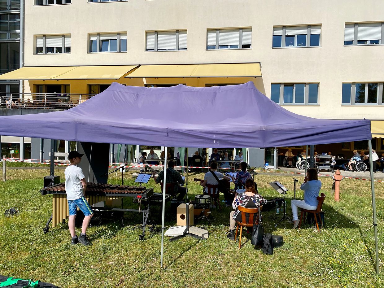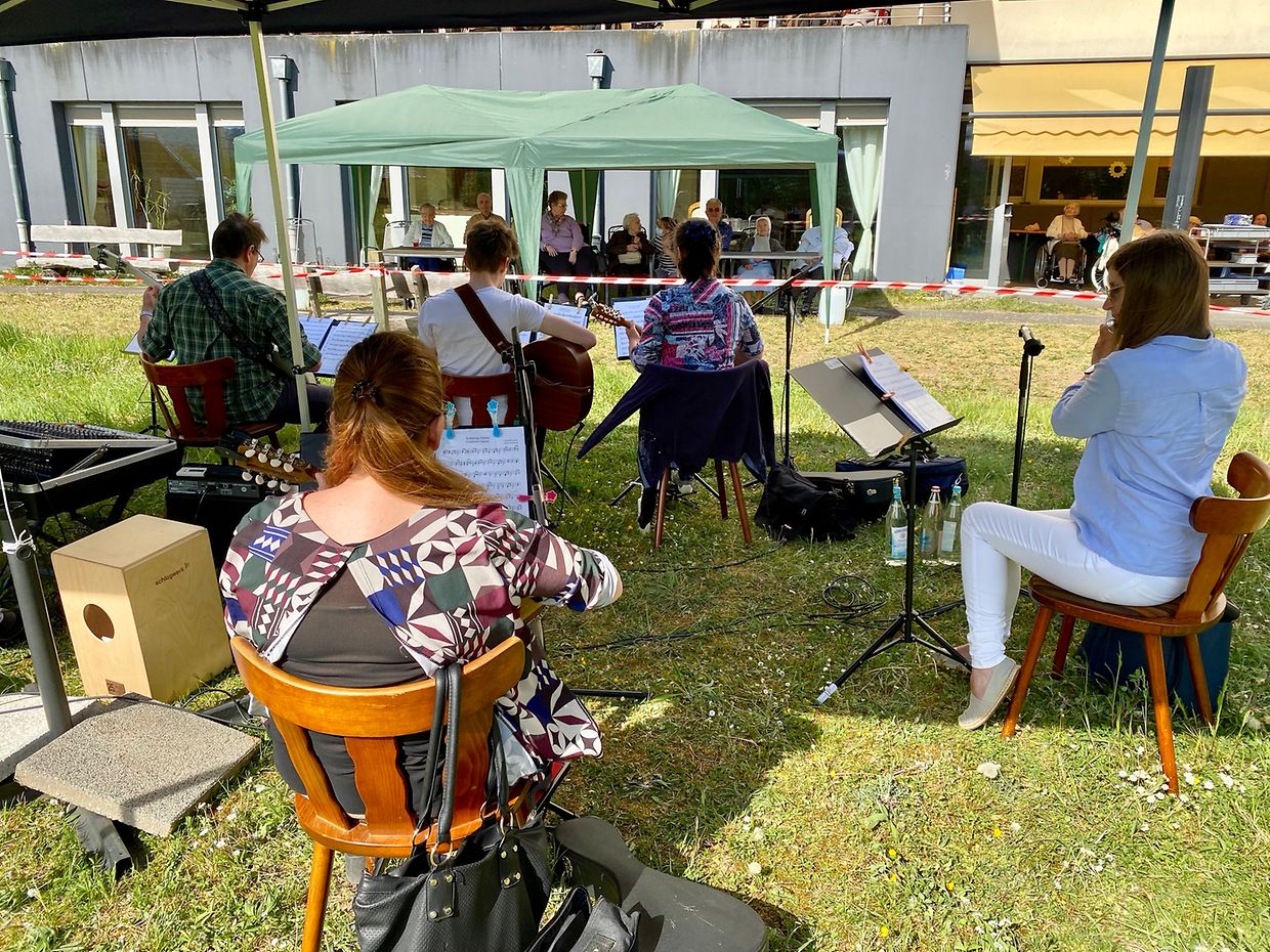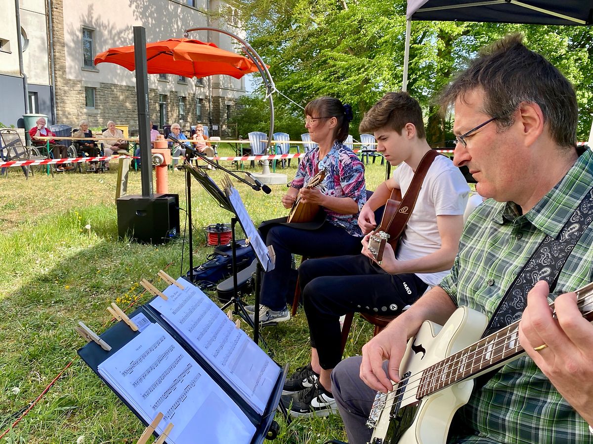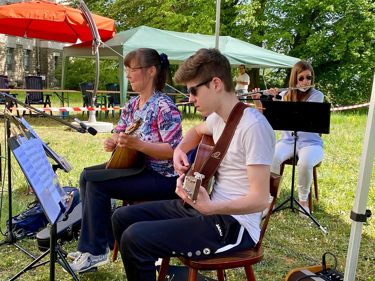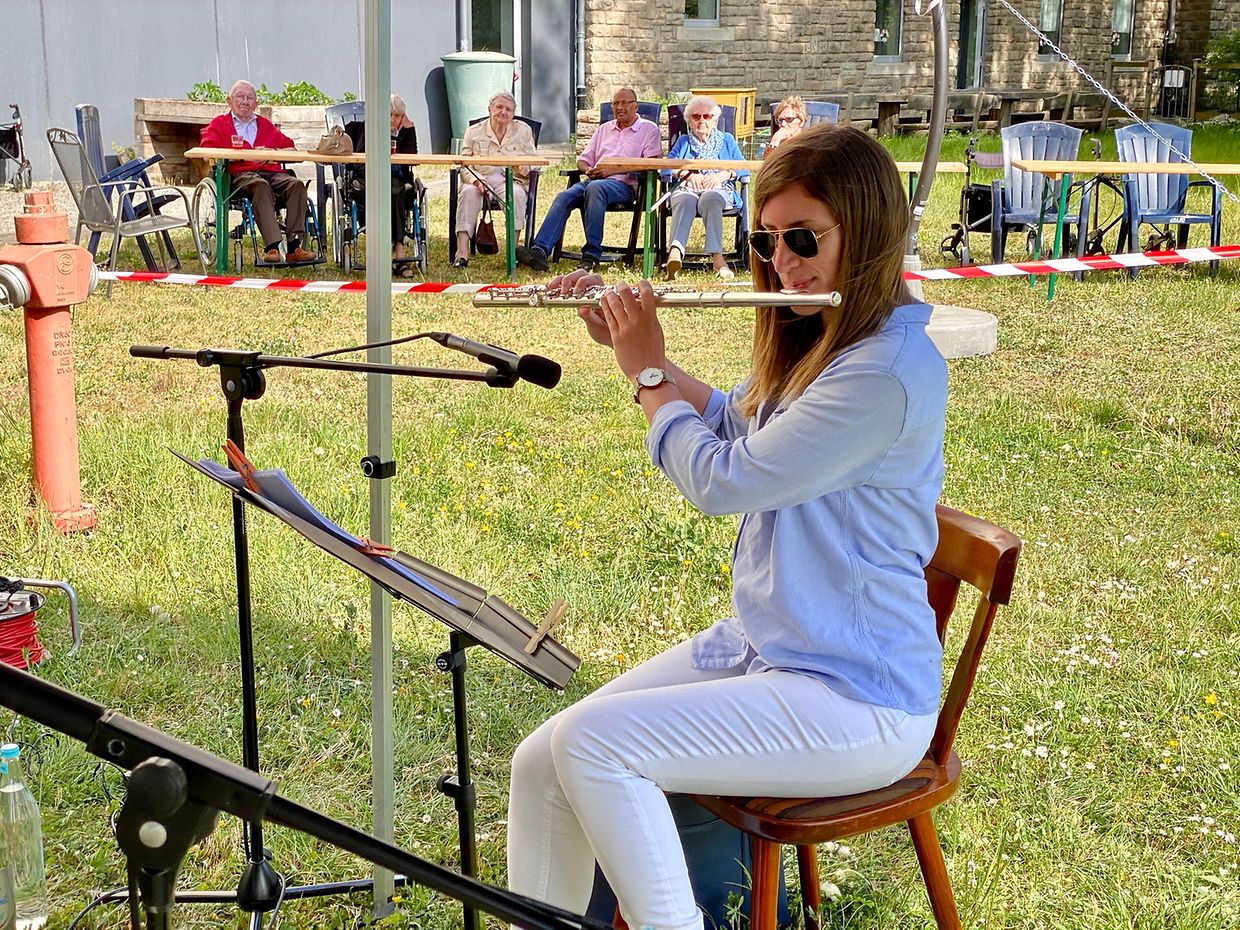 Groß war die Freude bei den Bewohnern des Altenheims in Mersch als bei herrlichem Wetter das Musikensemble Divertimento unter der Leitung von Isabelle Merlevede zum Konzert im Hof aufspielte. Bestbekannte Melodien aus der Feder der Leiterin wussten die zahlreichen Bewohner vollauf zu begeistern in dieser spezielle Zeit. Mit gebührendem Abstand spielten sich die Musikanten in die Herzen aller Anwesenden, die die gebotene Abwechslung richtig genossen und zu schätzen wussten. Die musikalischen Sonnenstrahlen erleichterten den Alltag und brachten liebevolle Erinnerungen aus vergangenen Zeiten ans Licht. Die Bewohner erlebten mit Freude die musikalische Ermunterung und bedankten sich mit viel Applaus bei dem Musikensemble Divertimento für das abwechslungsreiche und mitreißende Programm. Ein besonderes Lob gab es abschließend seitens der Direktion des Hauses, sowie die Einladung zu einem weiteren Konzert im Sommer.
