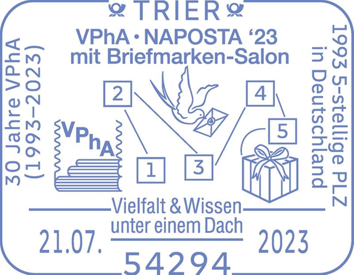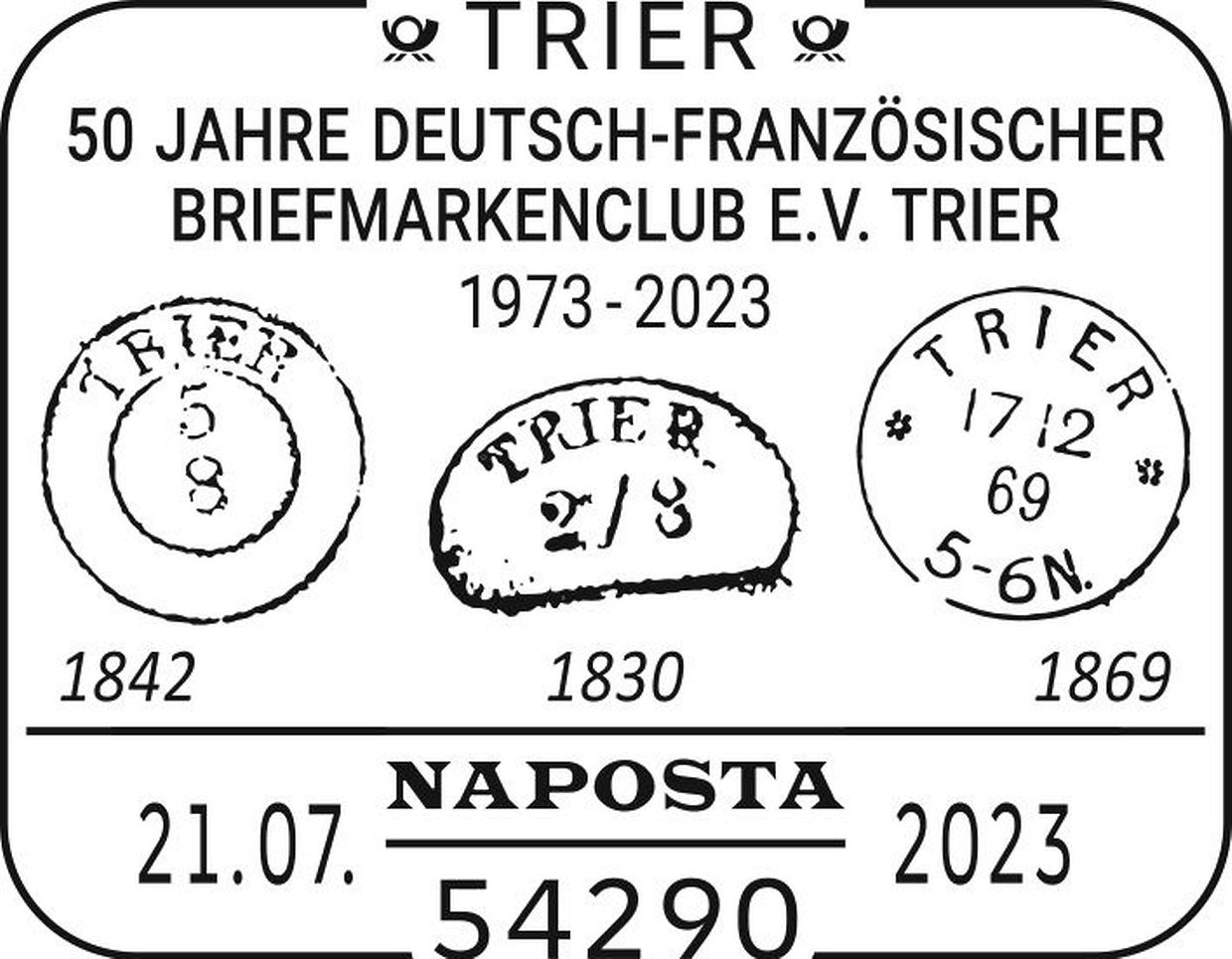 Der Deutsch-Französische Briefmarkenclub e.V. Trier feiert vom 20. Juli bis zum 23. Juli 2023 seinen 50. Geburtstag mit einer nationalen Briefmarkenausstellung in der Messehalle Trier, In den Moselauen 1, 54294 Trier, Deutschland.