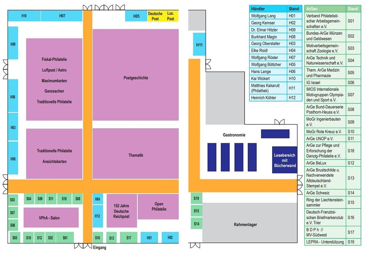 Im Wettbewerb sind auf 1.080 Rahmen Briefmarkensammlungen der Junioren und Senioren zu sehen. Daneben gibt es zwei Salons mit 120 Rahmen. Der Verband philatelistischer Arbeitsgemeinschaften und die Arbeitsgemeinschaft Brustschilde sind dafür verantwortlich. Die luxemburgische und die deutsche Post haben ebenfalls zwei Stände. Es gibt eine Messeganzsache der Deutschen Post AG. Mehr wie 12 Briefmarkenhändler und etwa 20 Arbeitsgemeinschaften sind ebenfalls vertreten.