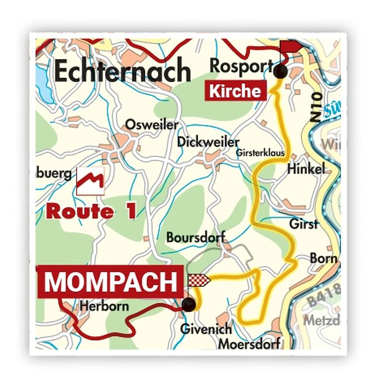 Strecke 2: Rosport-Girsterklaus-Mompach, 14,2 km. Start bei der Kirche. Parking bei der Grundschule in Rosport, Campus scolaire et sportif „Am Bongert“, 4 rue Luc Bonblet.