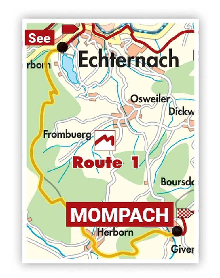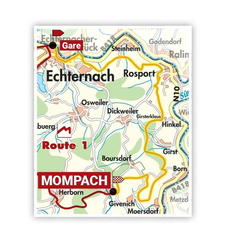 Strecke 1: Echternach Gare-Rosport-Girsterklaus-Mompach 22,9 km. Start und Parking am Gare/Busbahnhof in Echternach.