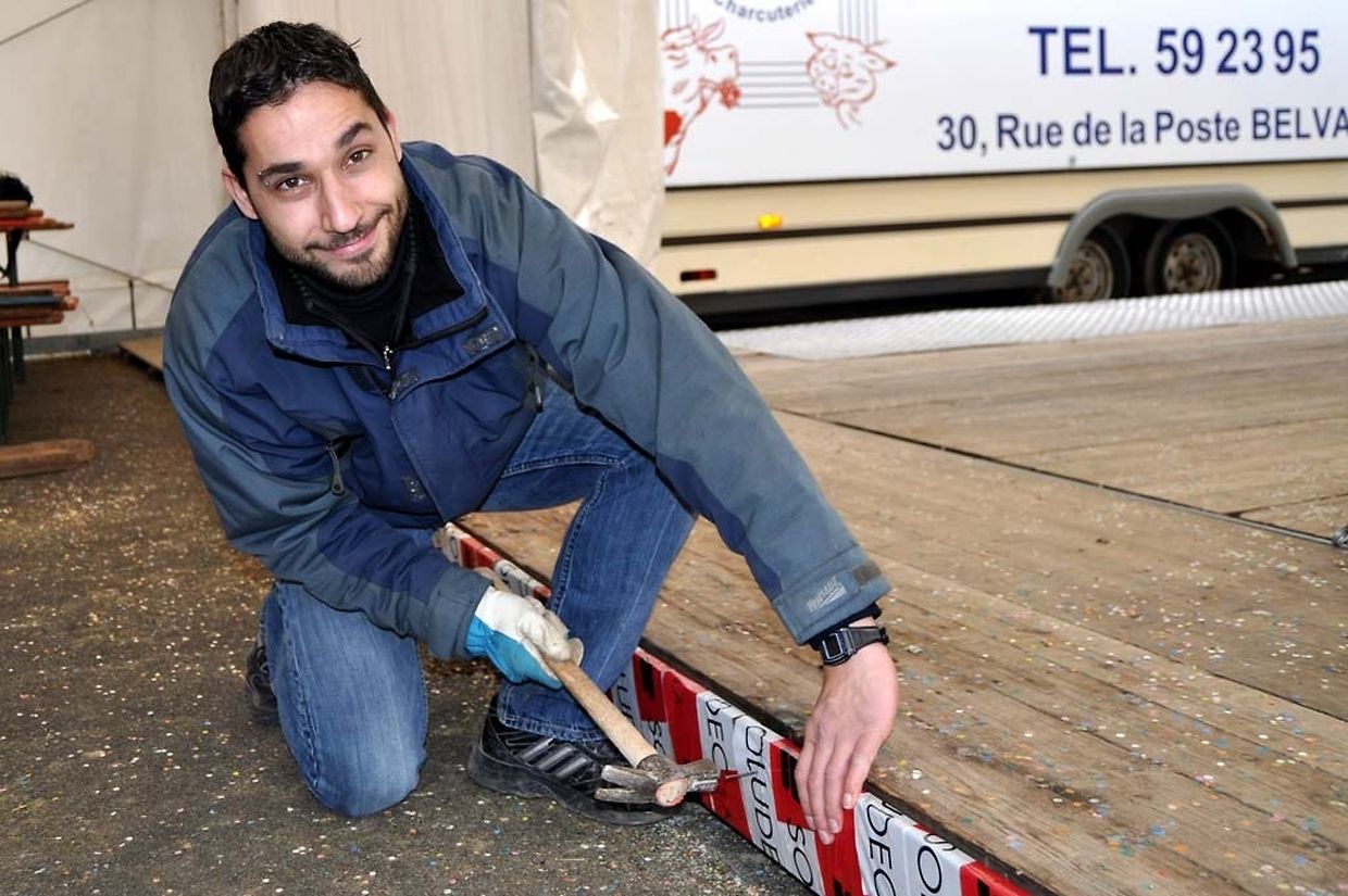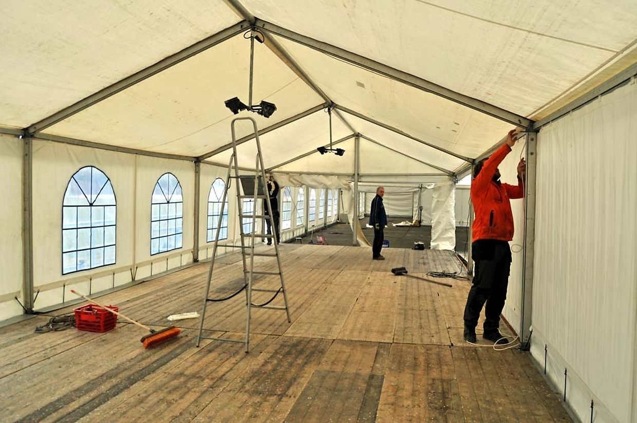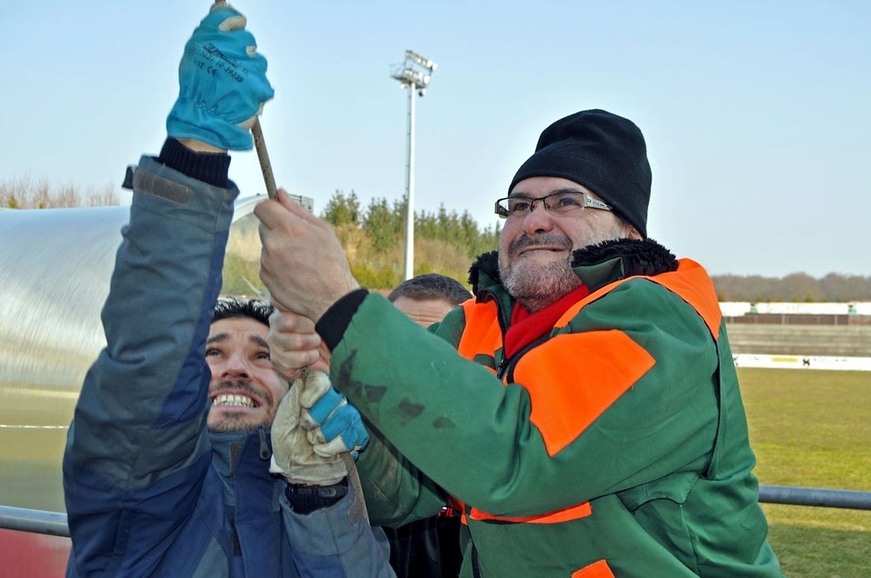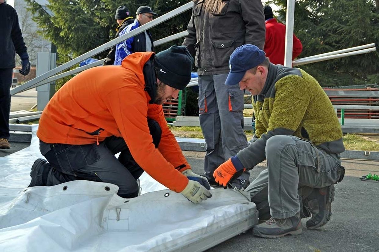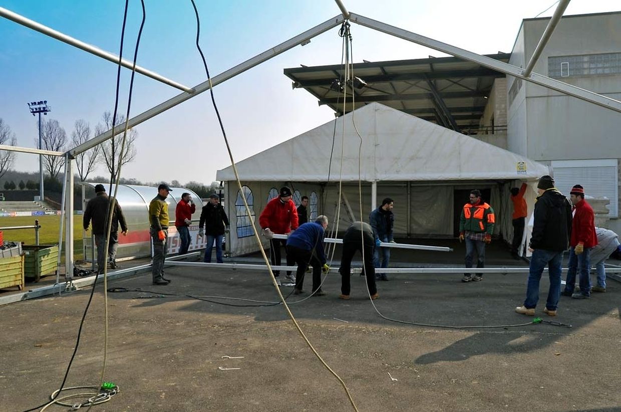 Um Donneschden de Moien ass et um Site vum Monnerecher Stade Communal mam Opriichte lass gaangen. Bei schéinstem awer kalem Wieder hunn eng ganz Rei Fräiwëlleger beim Opriichte vun den Zelter gehollef. Déi sti mëttlerweil esou, dass et um Freideg de moie mat deenen aneren Aarbechte weider goe kann.