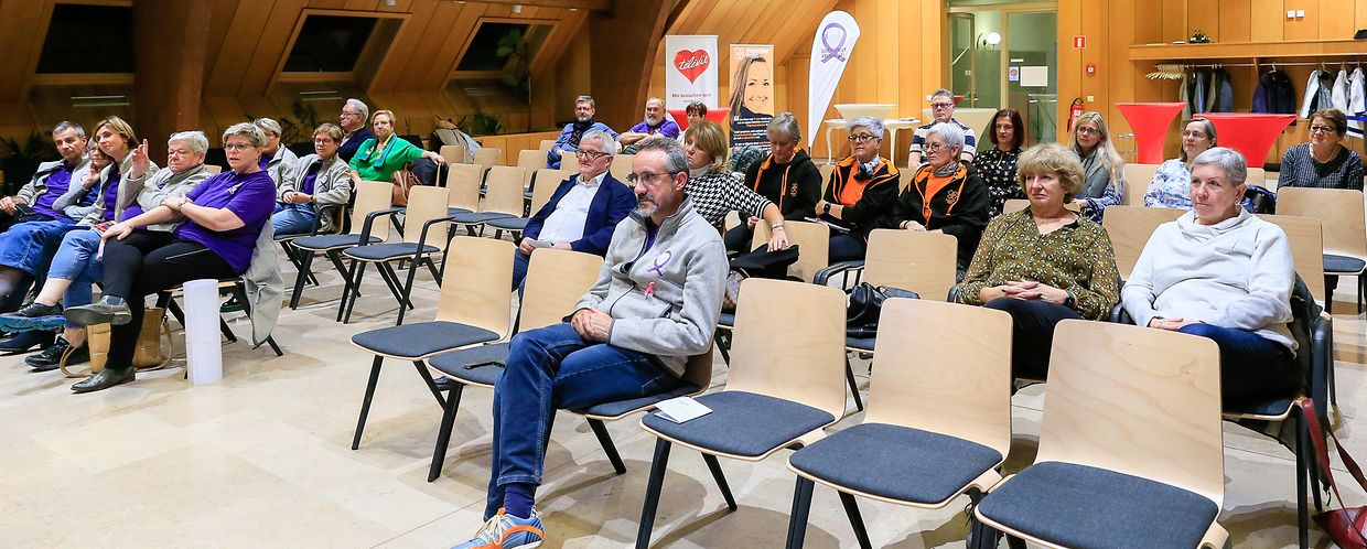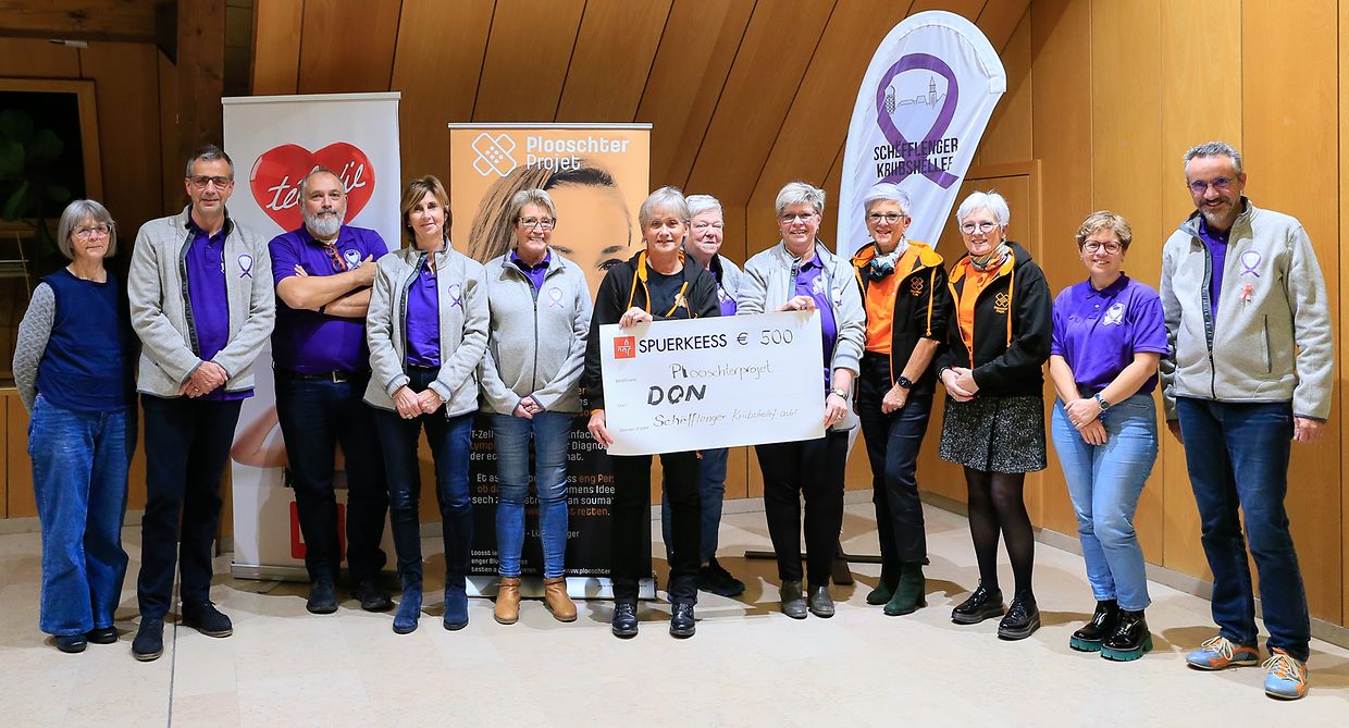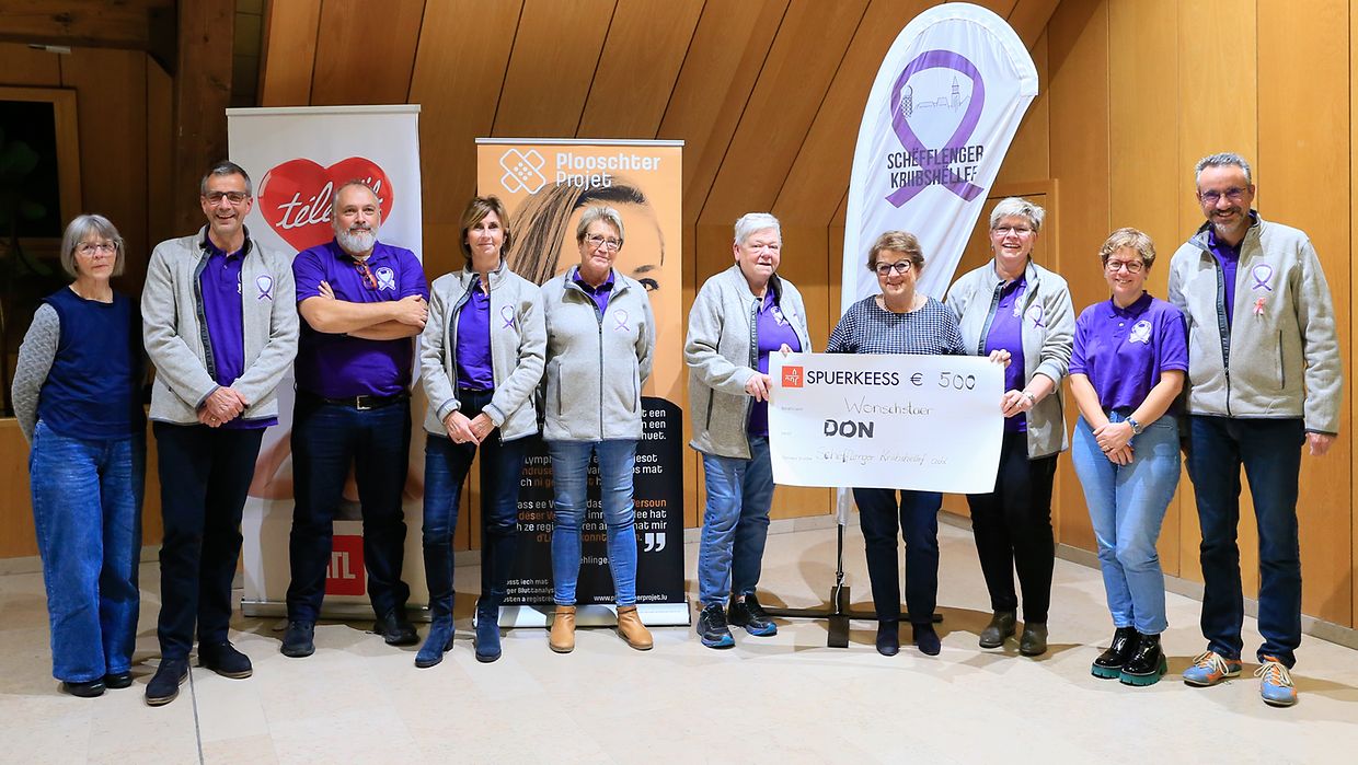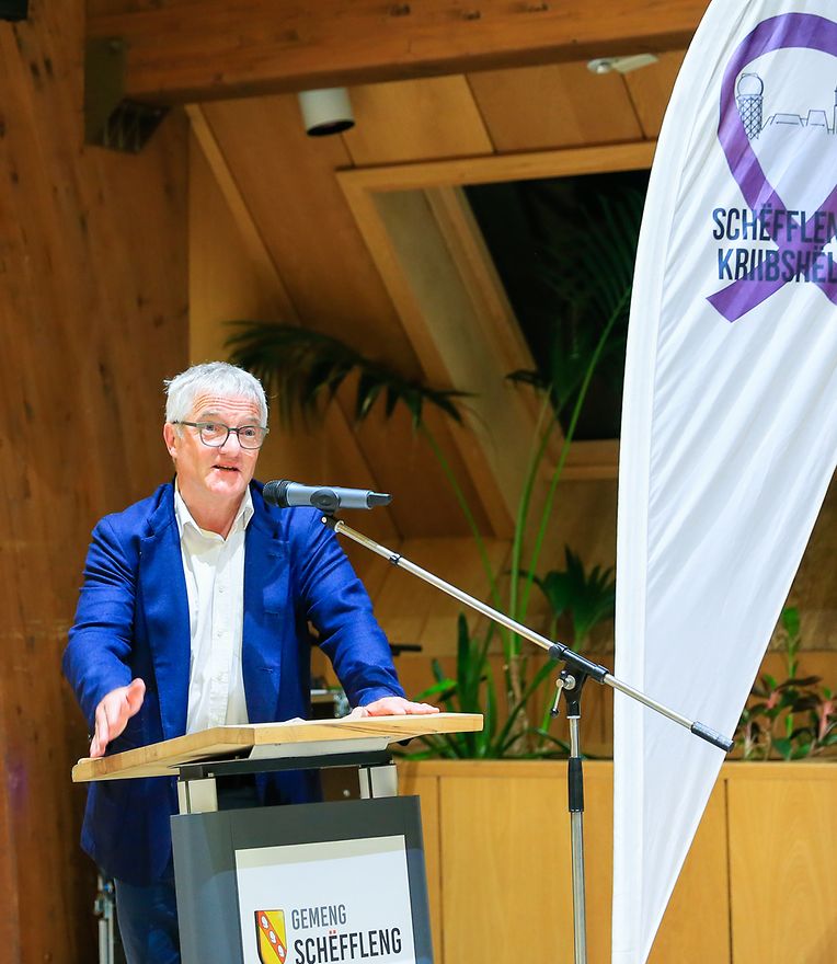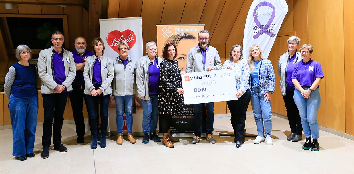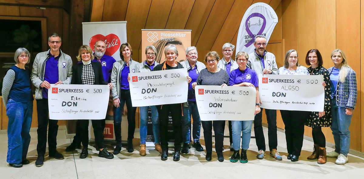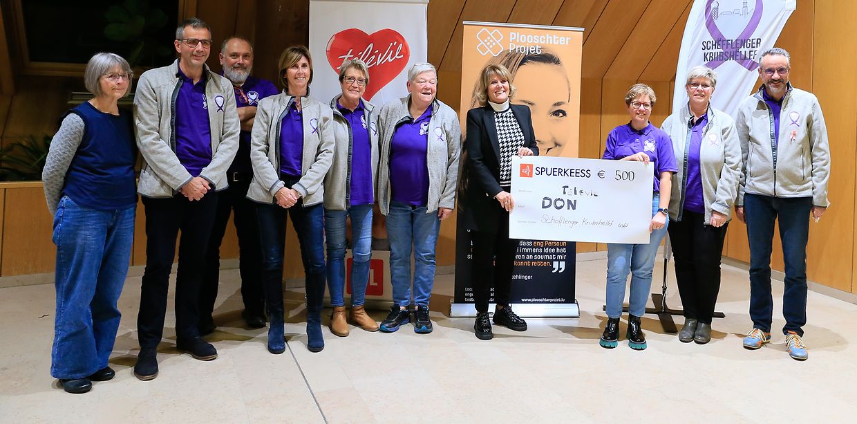 Schifflingen. Kürzlich fand im Gemeindesaal Gran-Duc Jean einer Konferenz über Krebs statt, diese Versammlung würde von der „Schëfflenger Kriibshëllef“ unter Leitung von Präsident Georges Kuhn und seinem Komitee organisiert. Für den fachlichen Teil waren Lex Schaul „Professionnel de santé publique“ der über Risikoreduzierung referierte, und die diplomierte Psychologin und Psychotherapeutin Martine Risch, die über psychoonkologische Betreuung von Menschen mit Krebs und ihren Angehörigen referierte, beide Referenten vertreten die „Fondation Cancer“ zum Abschluss der Veranstaltung wurden an 4 Organisationen im Beisein von Bürgermeister Paul Weimerskirch, jeweils einen Scheck in Höhe von 500 Euro überreicht, unter anderem an Diane Wunsch, Koordinatorin von Télévie Luxemburg sowie an Christiane Lieners vom Plooschterprojet, an ALGSO Sportgruppe für Krebspatienten vertreten durch die Sekretärin Arlette Hofmann-Hinterscheid für die Fondation Wonchstär nahm Annette De March vom Verwaltungsrat den Scheck von 500 Euro in Empfang.