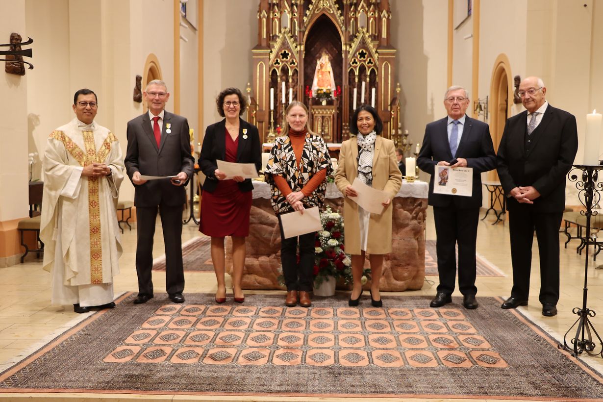 A Vertriedung vum President Romain Richer huet de Vizepresident François Metz de Sängerinnen a Sänger hir Verdéngschter ervirgestrach an den Här Paschtouer Alberto Chambi huet d' Auszeechnunge verdeelt. D' Madame Charito Yangson an d' Dirigentin Madame Isabelle Heischbourg krute fir 5 Joer Déngscht d' Insigne de Mérite ugespéngelt. D' Madame Eva-Maria Geis an den Här Romain Diedenhofen, dee leider net selwer konnt do sinn, hu sech d' Bronzemedail fir 10 Joer Sange verdéngt. De Pierre Fourné huet dem Romain seng Medail entgéintgeholl . Fir 20 Joer aktiven Déngscht gouf den Här Matthias Geis mat der Sëlwermedail ausgezeechent.