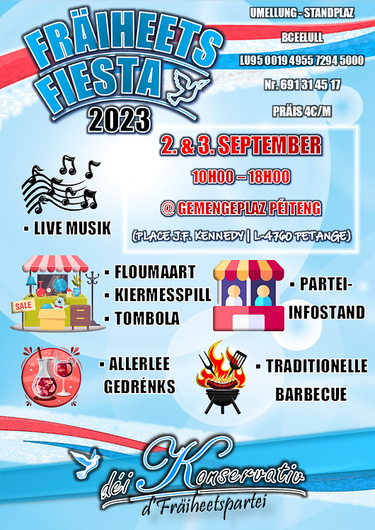 Mir invitéieren häerzlechst op eis traditionell Fräiheetsfiesta, d'Parteifest vun de Konservativen, daat mir all Joers mat Iech als eis Memberen, Frënn a Sympathisante feieren! 📷📷📷
