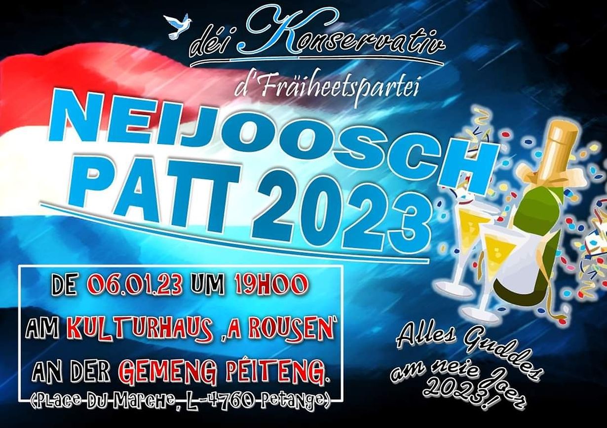 Eis Partei huet d'Freed Iech op eisen ëffentleche Neijooschpatt, Freides de 6. Januar 2023 um 19h00 an d'Kulturhaus a 'Rousen' op Péiteng z'invitéieren. Save the date! 🥂🎉🇱🇺