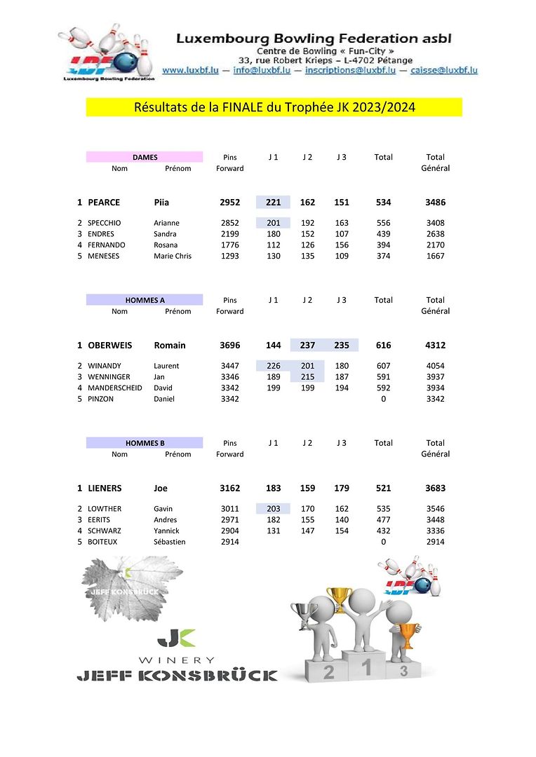 Pétange LBF - Finale Trophée Jeff Konsbruck 2023/2024 Luxembourg Bowling Federation 8 Galerie d'images Faites défiler la page vers le bas pour voir plus d'images. Publié le samedi 28 septembre 2024 à 14:07 Petingen, Luxemburg Resultater vun der Finale vum Trophée Jeff Konsbruck 2023/2024 Signaler contenu inapproprié Plus de nouvelles de Luxembourg Bowling Federation > LBF - Tour 2 vum Championnat Doublette 2024/2025 16/12/24 Pétange LBF - Tour 4 vum SWCC 2024/2025 09/12/24 Pétange LBF - Tour 1 du Championnat Doublette 2024/2025 01/12/24 Pétange LBF - Resultater vum Fun-Turnéier 9 No-Tap 23/11/24 Pétange LBF - Tour 3 vum SWCC 2024/2025 18/11/24 Pétange