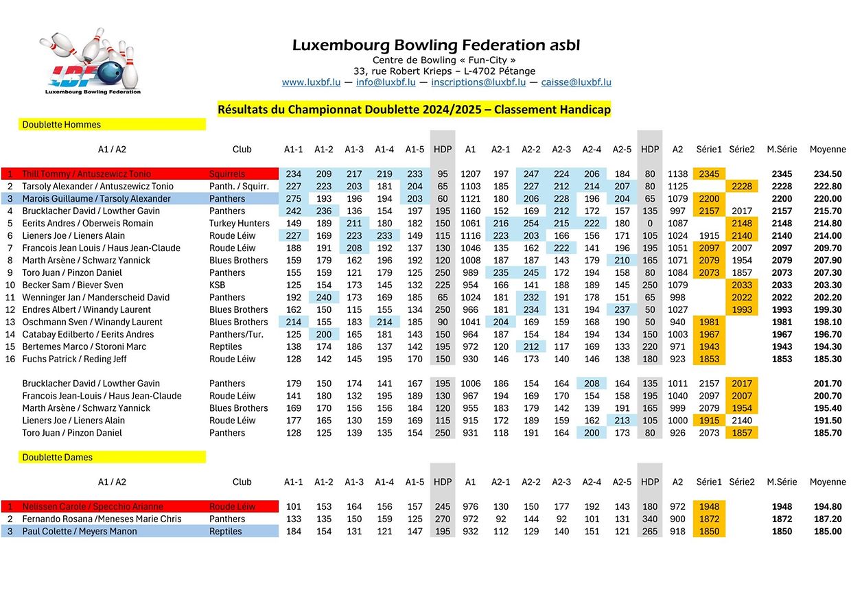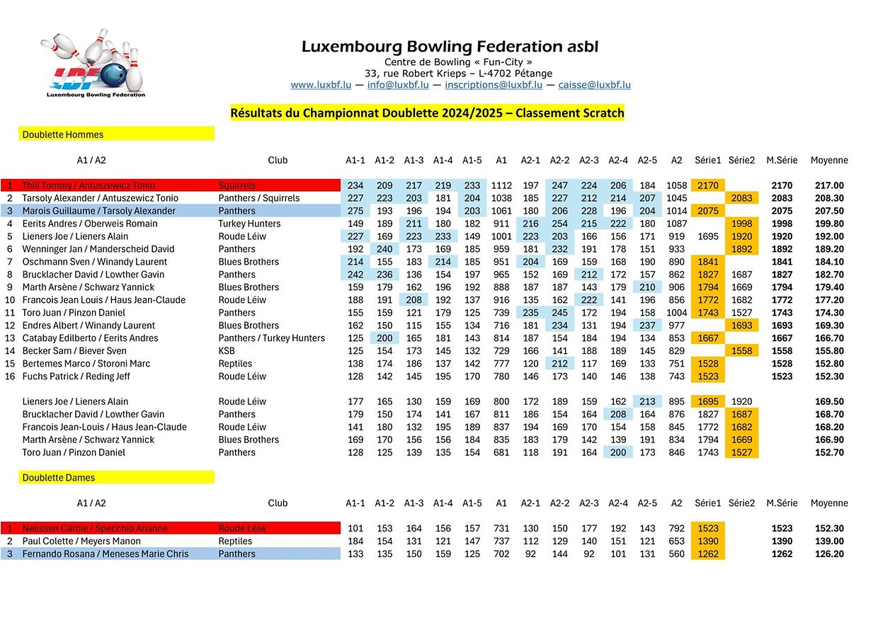 Pétange LBF - Tour 2 vum Championnat Doublette 2024/2025 Luxembourg Bowling Federation 3 Galerie d'images Faites défiler la page vers le bas pour voir plus d'images. Publié le lundi 16 décembre 2024 à 20:16 Petingen, Luxemburg Resultater vun Doublette Championnat 2024/2025 Weider Info'en op www.luxbf.lu Signaler contenu inapproprié Plus de nouvelles de Luxembourg Bowling Federation > LBF - Tour 4 vum SWCC 2024/2025 09/12/24 Pétange LBF - Tour 1 du Championnat Doublette 2024/2025 01/12/24 Pétange LBF - Resultater vum Fun-Turnéier 9 No-Tap 23/11/24 Pétange LBF - Tour 3 vum SWCC 2024/2025 18/11/24 Pétange LBF - Resultater vum CFS-Individuel 2024/2025 11/11/24 Pétange