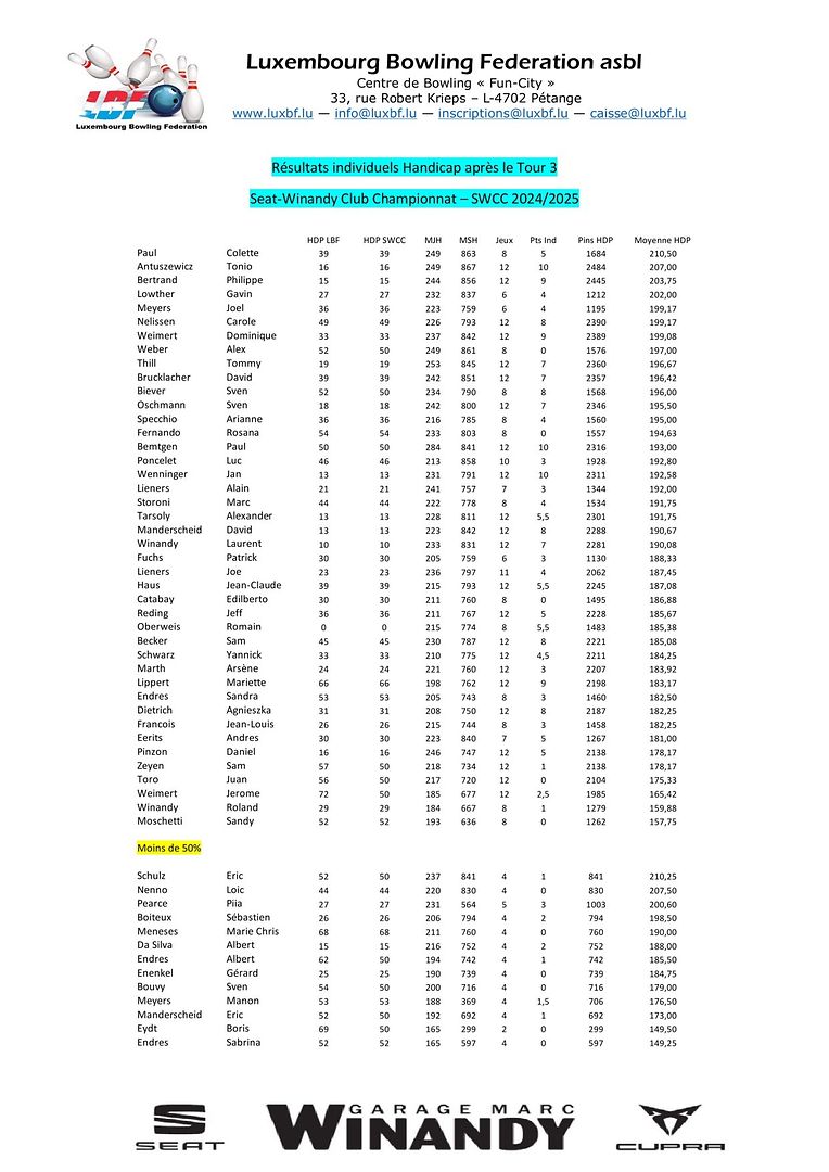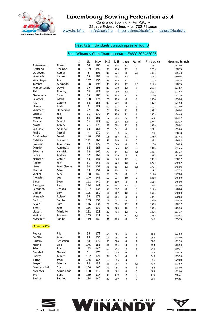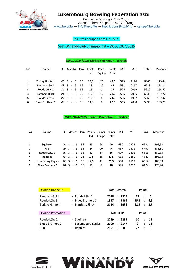 Pétange LBF - Tour 3 vum SWCC 2024/2025 Luxembourg Bowling Federation 4 Galerie d'images Faites défiler la page vers le bas pour voir plus d'images. Publié le lundi 18 novembre 2024 à 21:01 Petingen, Luxemburg Resultater vum Tour vum SWCC 2024/2025 Weider Infoen op www.luxbf.lu Signaler contenu inapproprié Plus de nouvelles de Luxembourg Bowling Federation > LBF - Tour 2 vum Championnat Doublette 2024/2025 16/12/24 Pétange LBF - Tour 4 vum SWCC 2024/2025 09/12/24 Pétange LBF - Tour 1 du Championnat Doublette 2024/2025 01/12/24 Pétange LBF - Resultater vum Fun-Turnéier 9 No-Tap 23/11/24 Pétange LBF - Resultater vum CFS-Individuel 2024/2025 11/11/24 Pétange