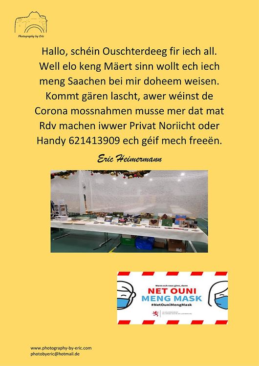 Redange/Attert Klengen Hobbymaart bei mir doheem Eric Heimermann Publié le dimanche 4 avril 2021 à 11:00 8545 Redingen, Luxemburg Signaler contenu inapproprié Plus de nouvelles de Eric Heimermann > den Nidderpallener Gesank hat hiert Merciiessen mat schéck iwwerrechung 11/11/24 Redange/Attert Eng schéi Muttergottesfeier zu Nidderpallen 19/08/24 Niederpallen Muttergottesfeier op dem 15. August zu Rippweiler 19/08/24 Rippweiler Schwaarz Schwanen 12/08/24 Heisdorf (Steinsel) Helleger Klara, d'Patréinesch vun der Par Atertdall Sainte-Claire. 12/08/24 Redange/Attert