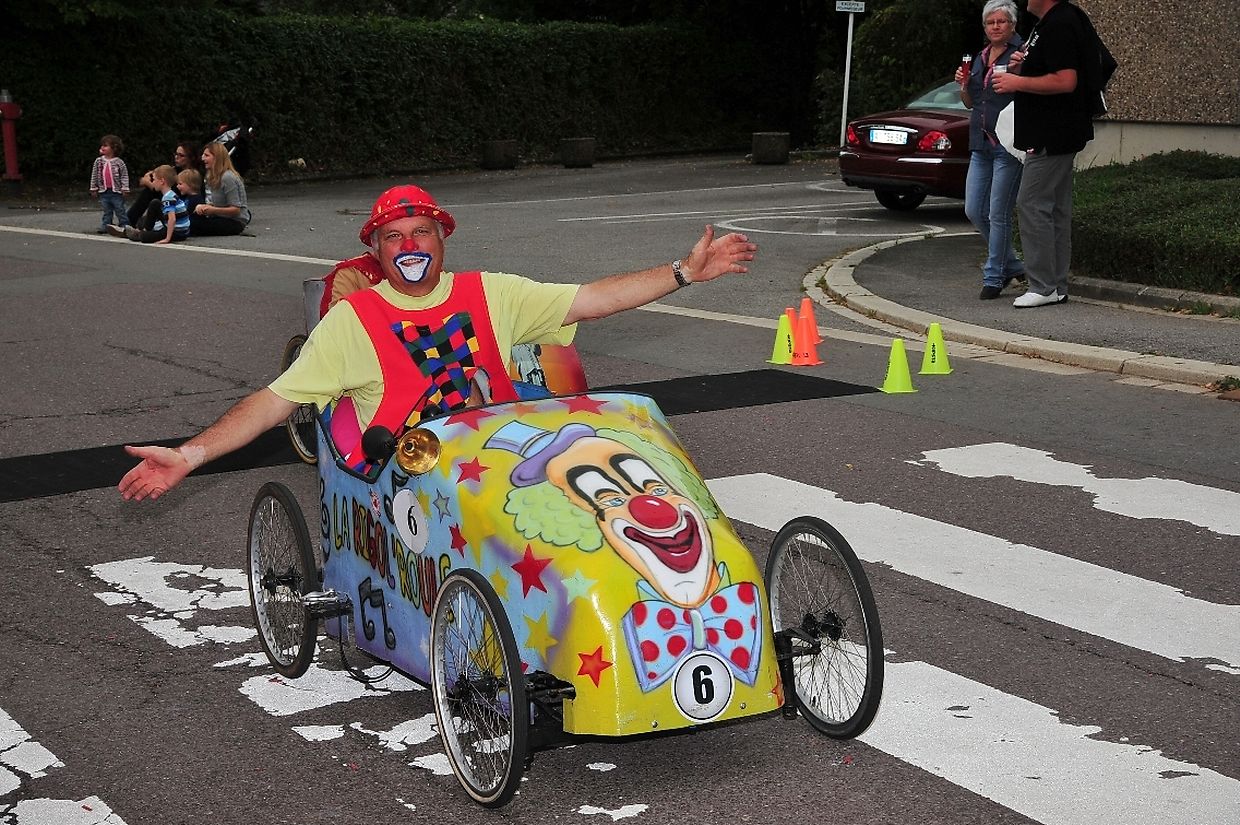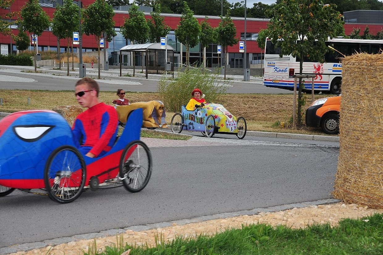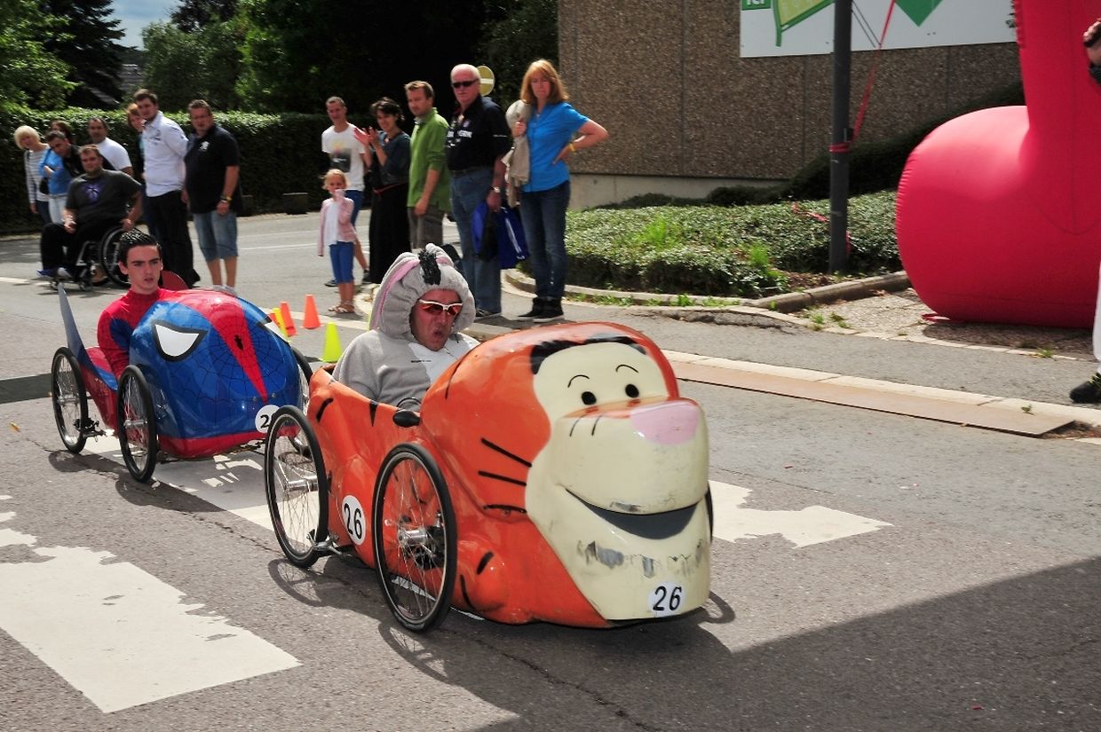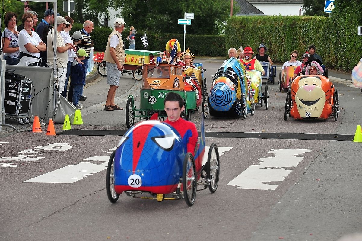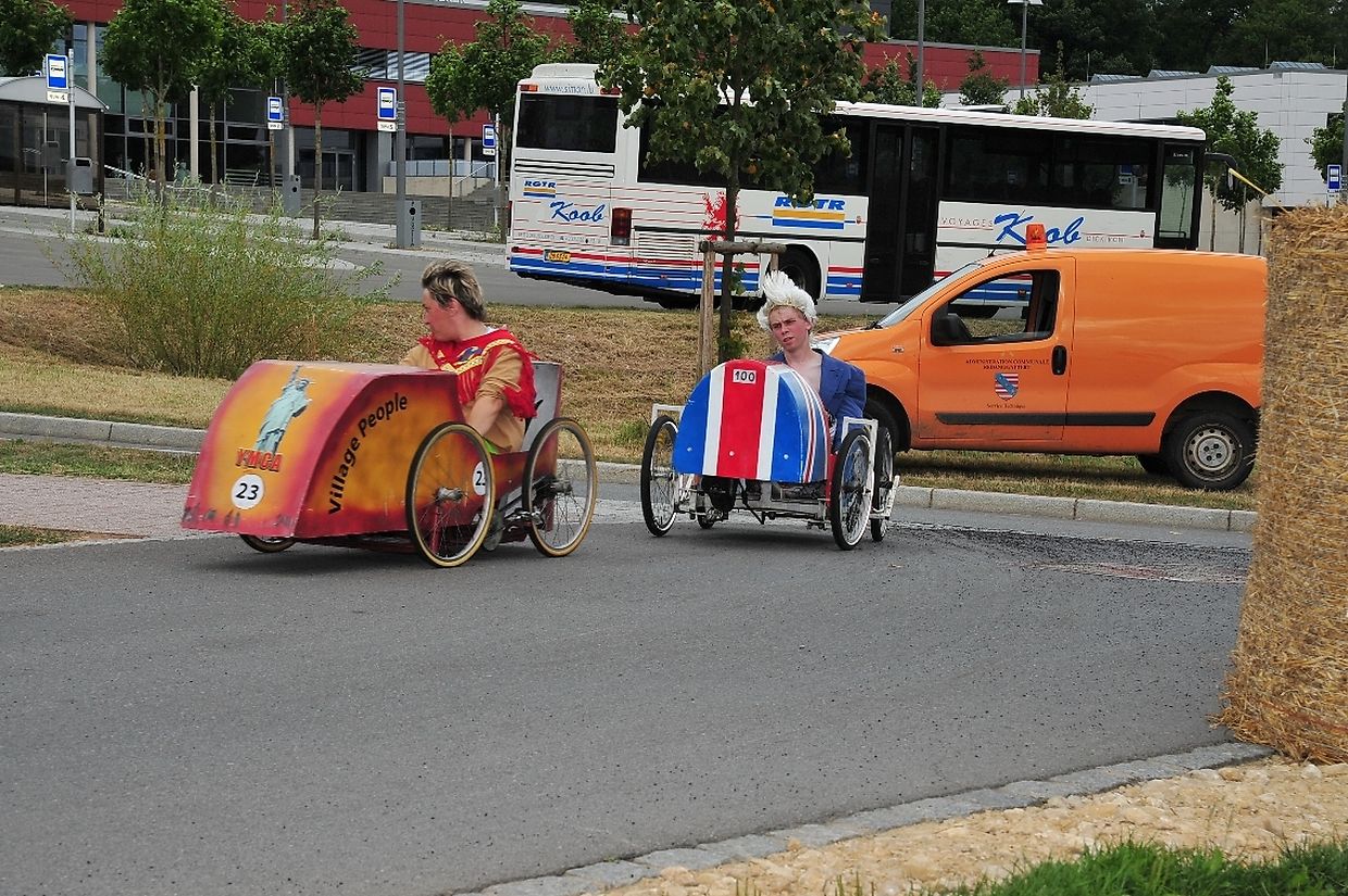 Am 18. August war es das erste Mal dass die Seifenkisten und ihre wagemutigen Fahrer in ihren farbigen Kostümen in Redingen/ Attert in ihren tollen Kisten an den Start gingen und mit bis zu 50 Sachen den Straßen Abhang beim Atert Lycée hinuntersausten. Seifenkisten sind aus Holz, Sperrholz- Kohlefaser oder ähnlichen Materialien selbst konstruierte oder auf vorgefertigten Bausätzen montiert.