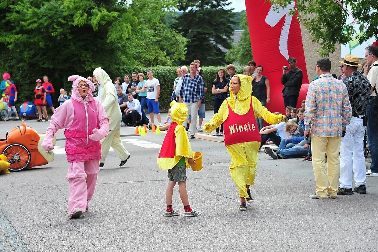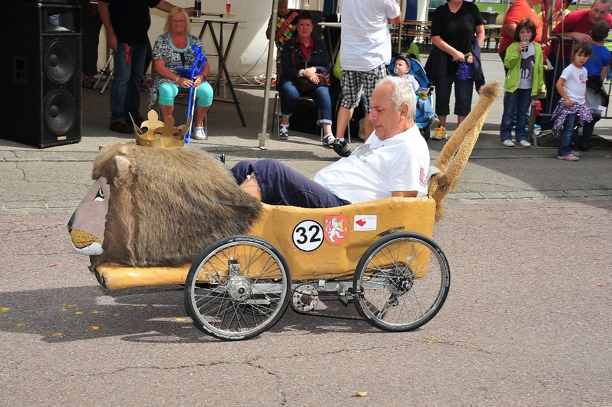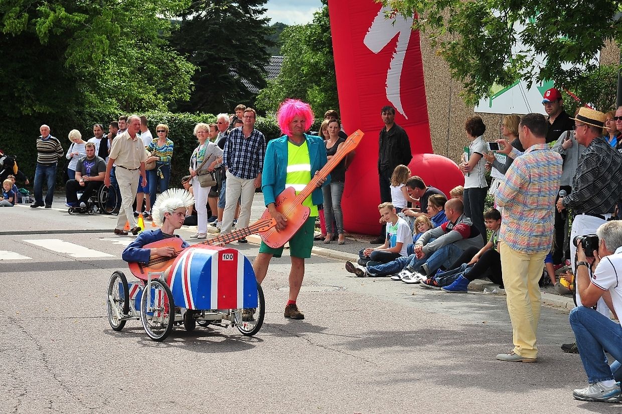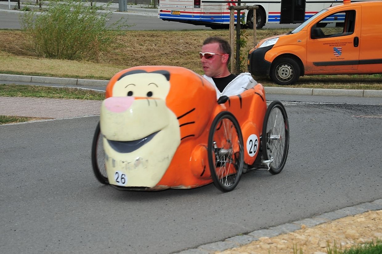 Die vierrädrigen buntbemalten und abenteuerlichen motorlosen Renner deren Antriebstechnik mit Kette und Pedalen auf Fahrradbasis besteht, lieferten sich nach dem Startschuss von Tom Faber, Vorsitzender der Sportkommission Gemeinde Redingen auf dem rund 900 Meter langem Parcours während zwei Stunden zeitweise spektakuläre Auseinandersetzungen. Dieses außergewöhnliche Rennen zählt zur Europameisterschaft der Seifenkistenrennen die von der „ Fédération Française des Clubs de Voitures à Pédales“ (FFCVP) organisiert worden war und die jedes Jahr auch in Frankreich, Italien, Österreich und der Tschechischen Republik ausgetragen wird. (TEXT/FOTOS: CHARLES REISER)
