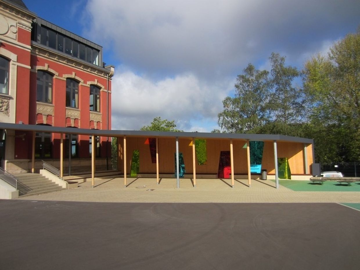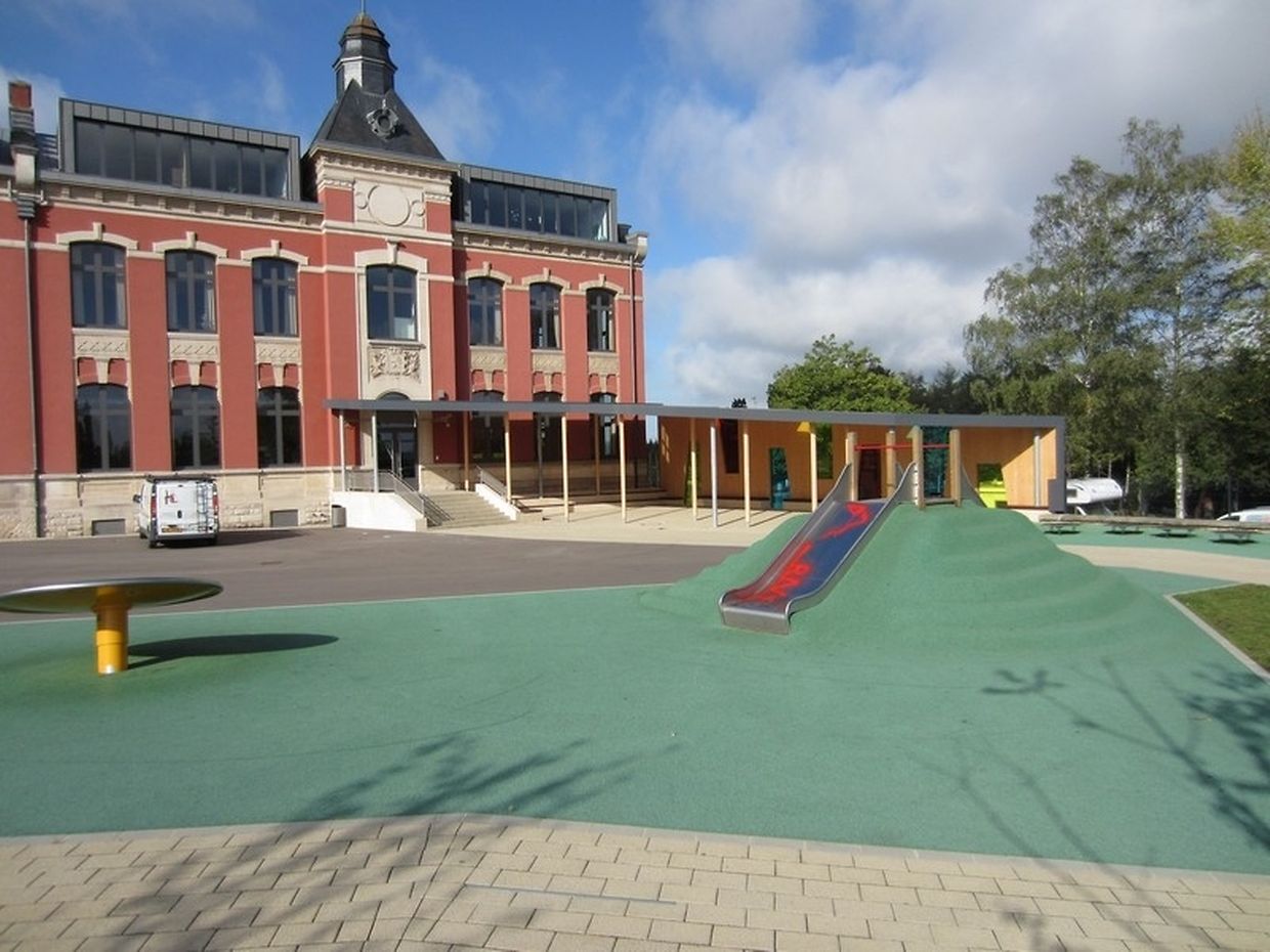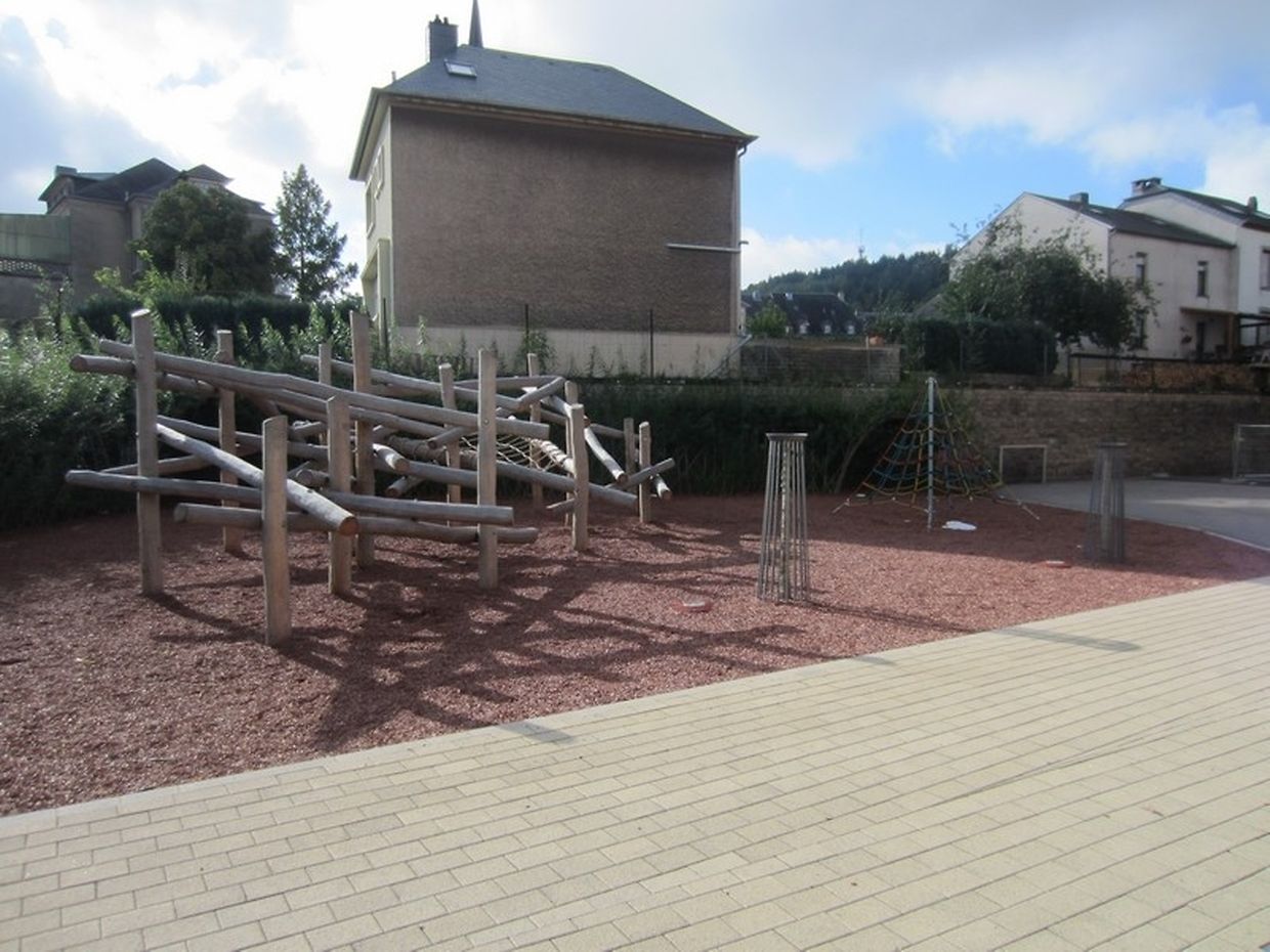 Der Schulhof der "Neiwiss"-Schule wurde 2010 nach der Renovierung des Schulgebäudes von Grund auf neu gestaltet. Das Konzept eines naturnahen Spiel- und Bewegungsareals wurde hier vollends respektiert. So endstand eine Fallschutzlandschaft mit einzelnen Spielelementen wie Wippen, Rutsche oder Hüpfplatten und ein Naturspielraum mit Baumstämmen und Holzpodesten als Sitzgelegenheiten. Außerdem wurde der Pausenhof stellenweise begrünt und neue Bäume wurden angepflanzt.