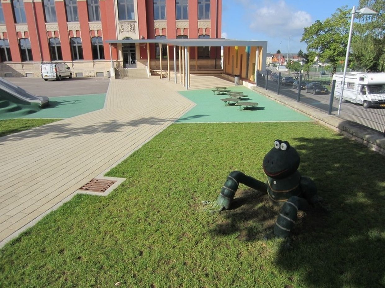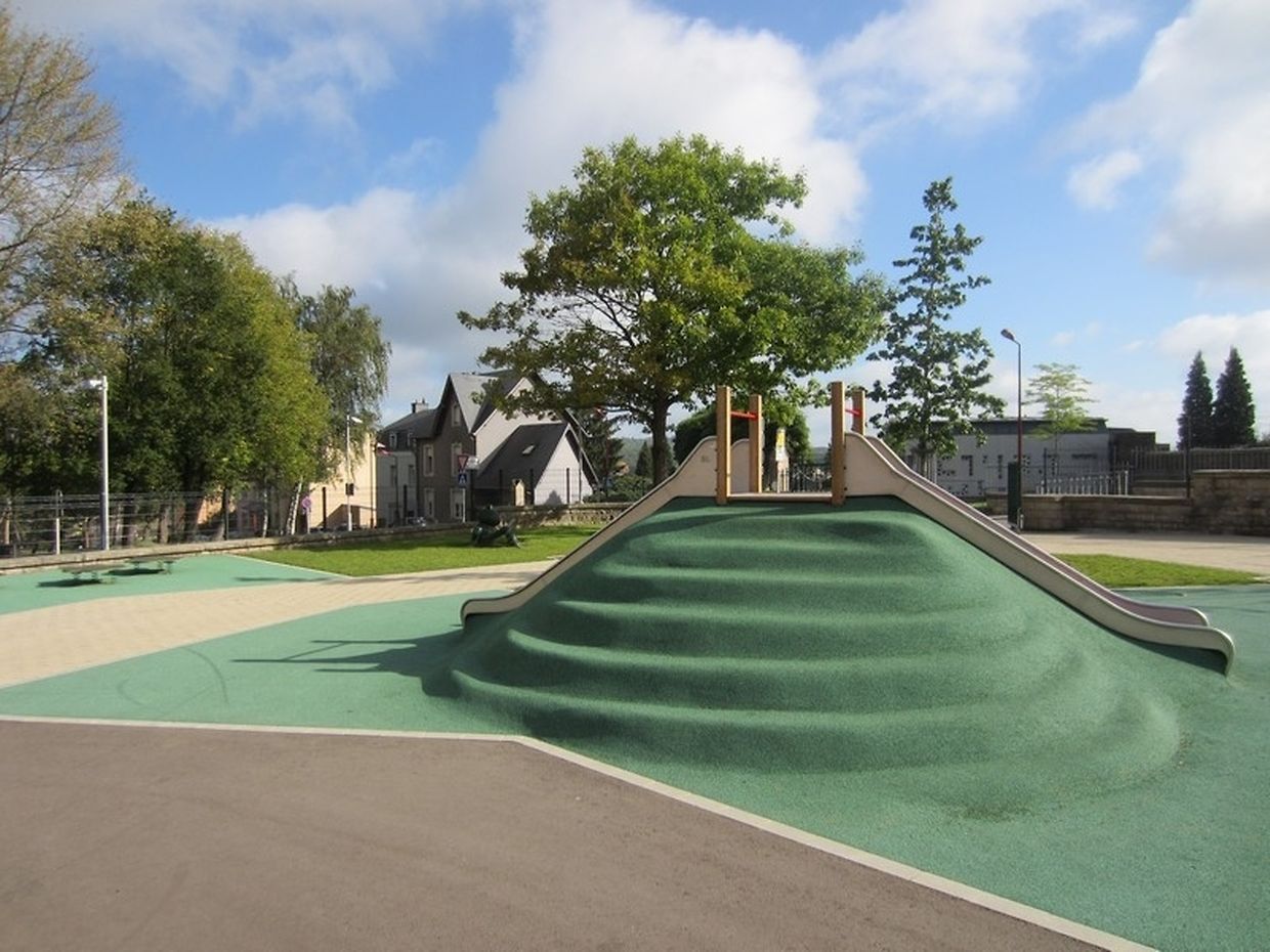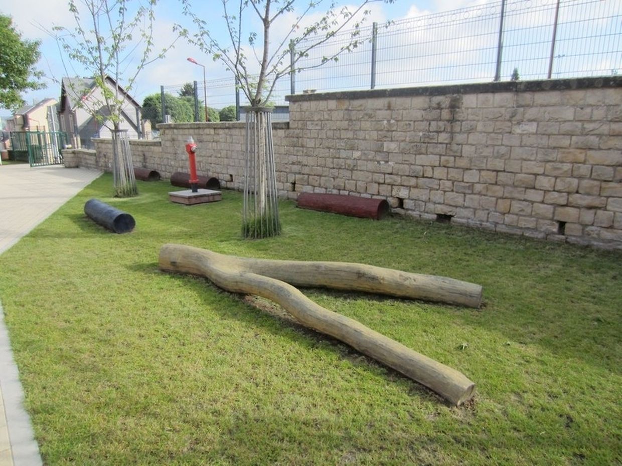 Der Schulhof der "Neiwiss"-Schule wurde 2010 nach der Renovierung des Schulgebäudes von Grund auf neu gestaltet. Das Konzept eines naturnahen Spiel- und Bewegungsareals wurde hier vollends respektiert. So endstand eine Fallschutzlandschaft mit einzelnen Spielelementen wie Wippen, Rutsche oder Hüpfplatten und ein Naturspielraum mit Baumstämmen und Holzpodesten als Sitzgelegenheiten. Außerdem wurde der Pausenhof stellenweise begrünt und neue Bäume wurden angepflanzt.