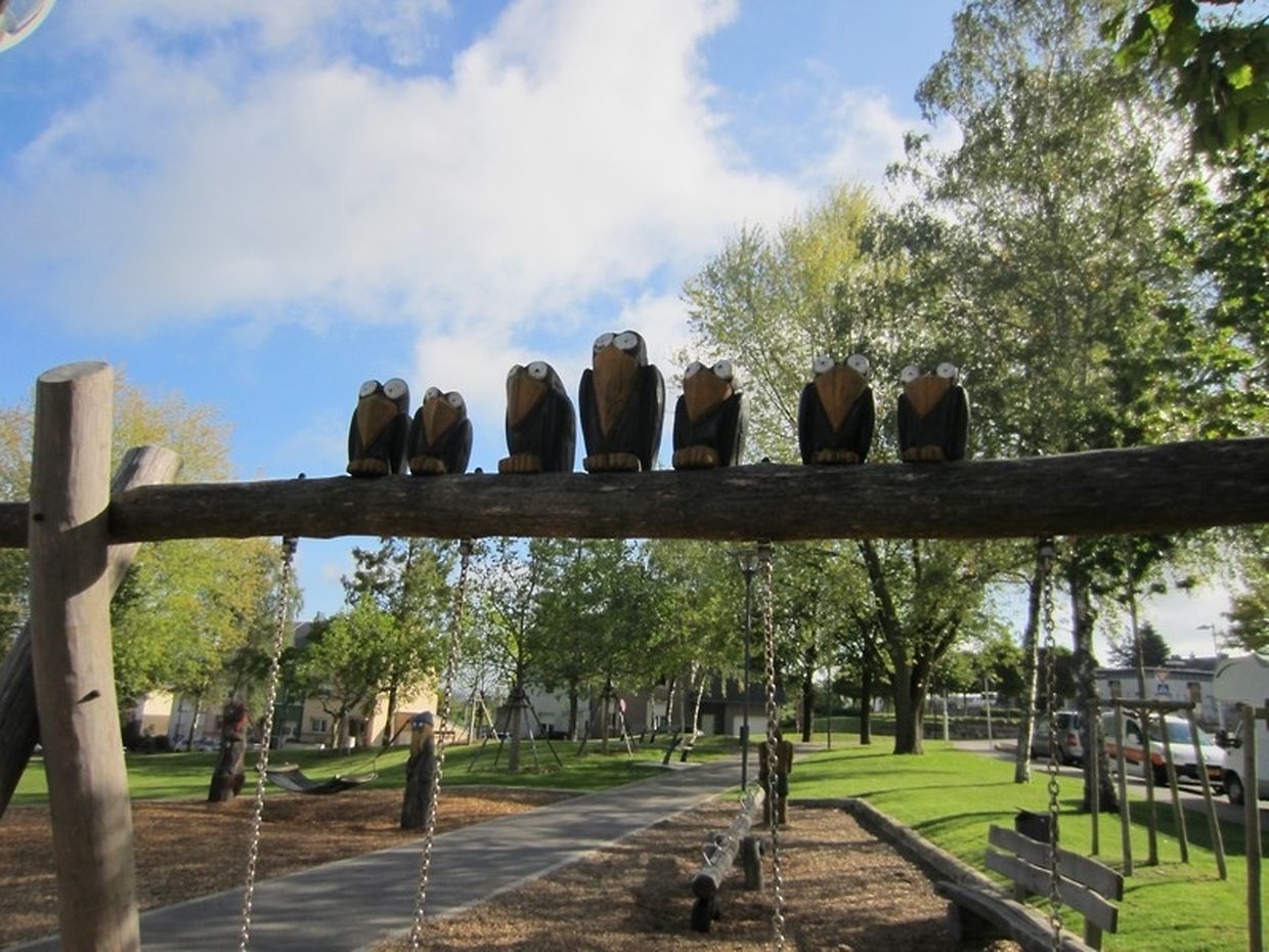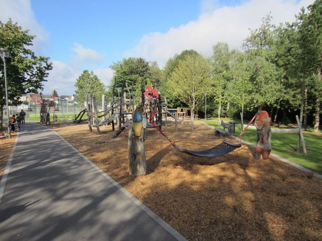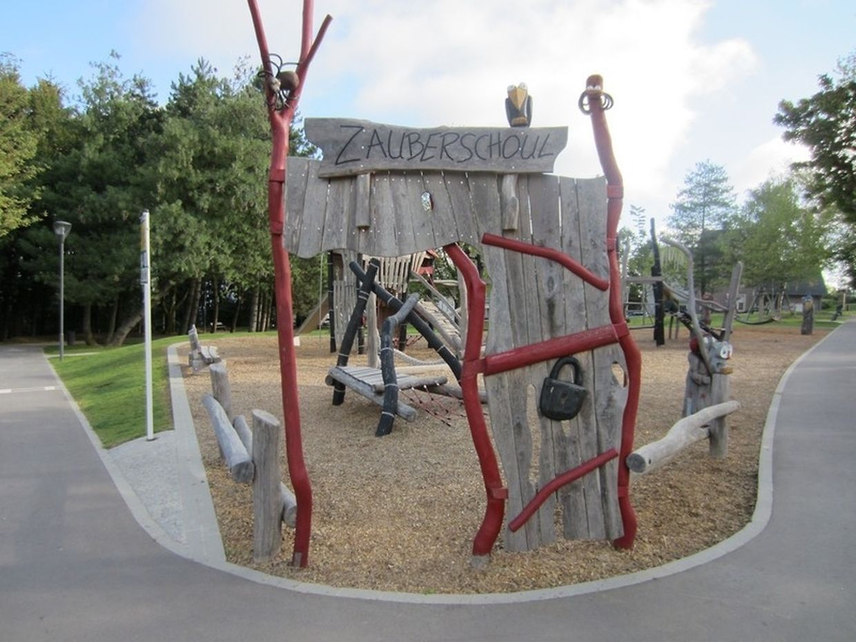 Gegenüber der Schule gibt es auch noch einen Spielplatz, der die verschiedenen neuen Elemente des Schulhofs ergänzt. Die "Zauberschoul" dieses Areals basiert auf dem gleichen Konzept einer umweltfreundlichen Bauweise, die auf Kunststoffe größtenteils verzichtet.