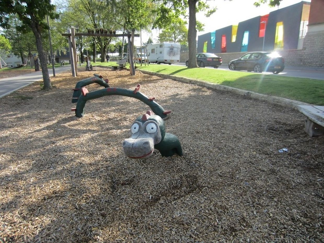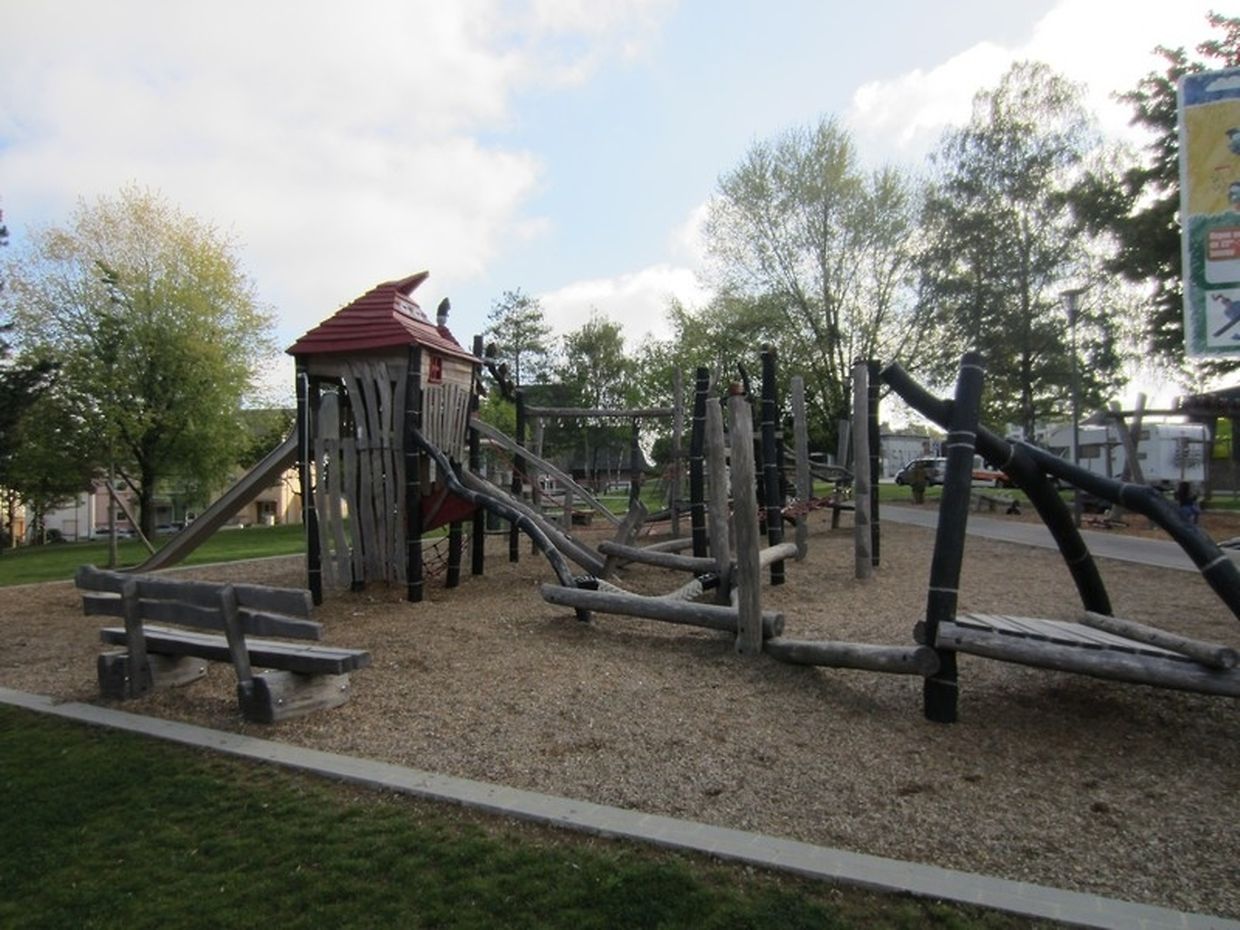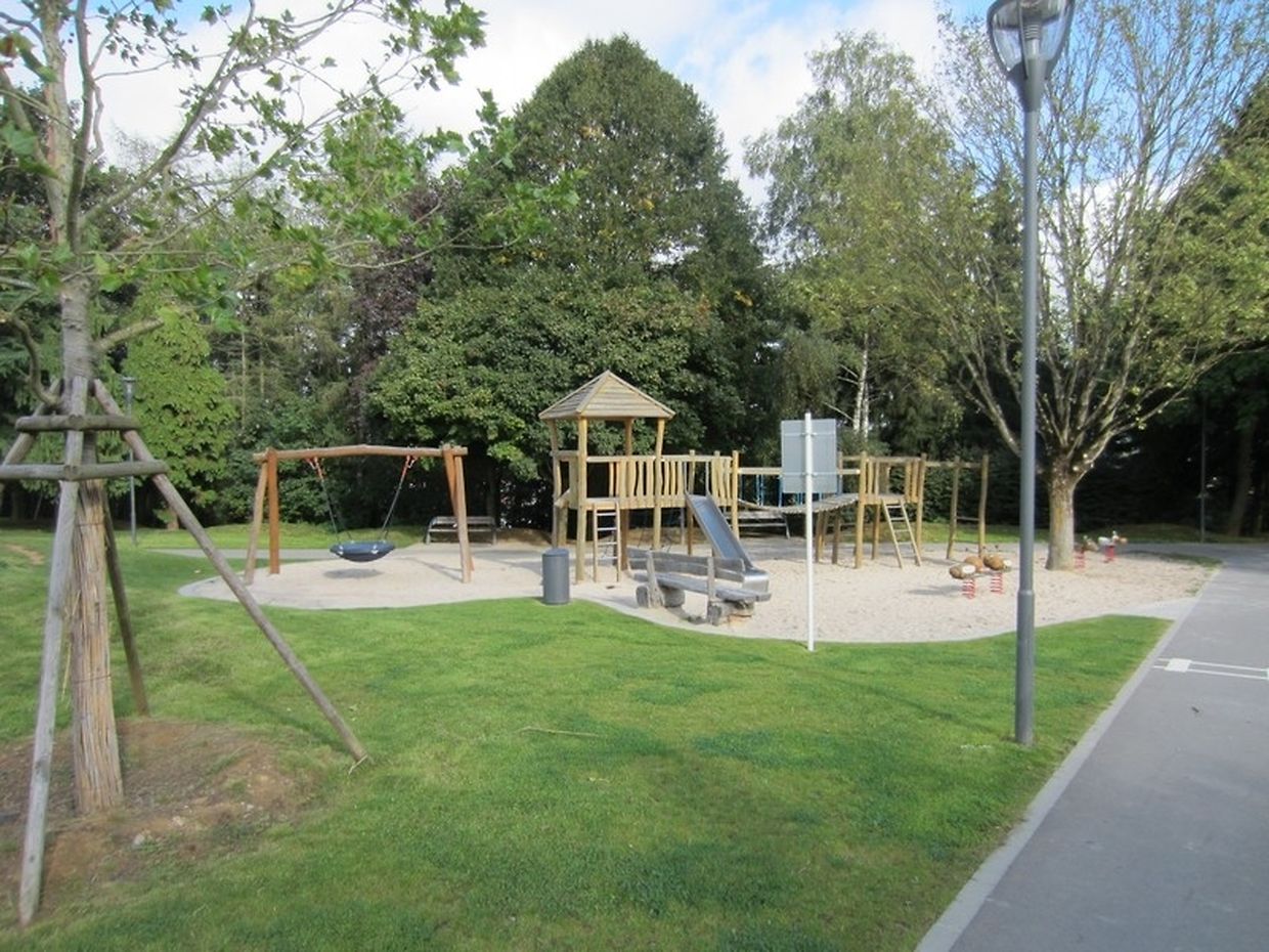 Gegenüber der Schule gibt es auch noch einen Spielplatz, der die verschiedenen neuen Elemente des Schulhofs ergänzt. Die "Zauberschoul" dieses Areals basiert auf dem gleichen Konzept einer umweltfreundlichen Bauweise, die auf Kunststoffe größtenteils verzichtet.
