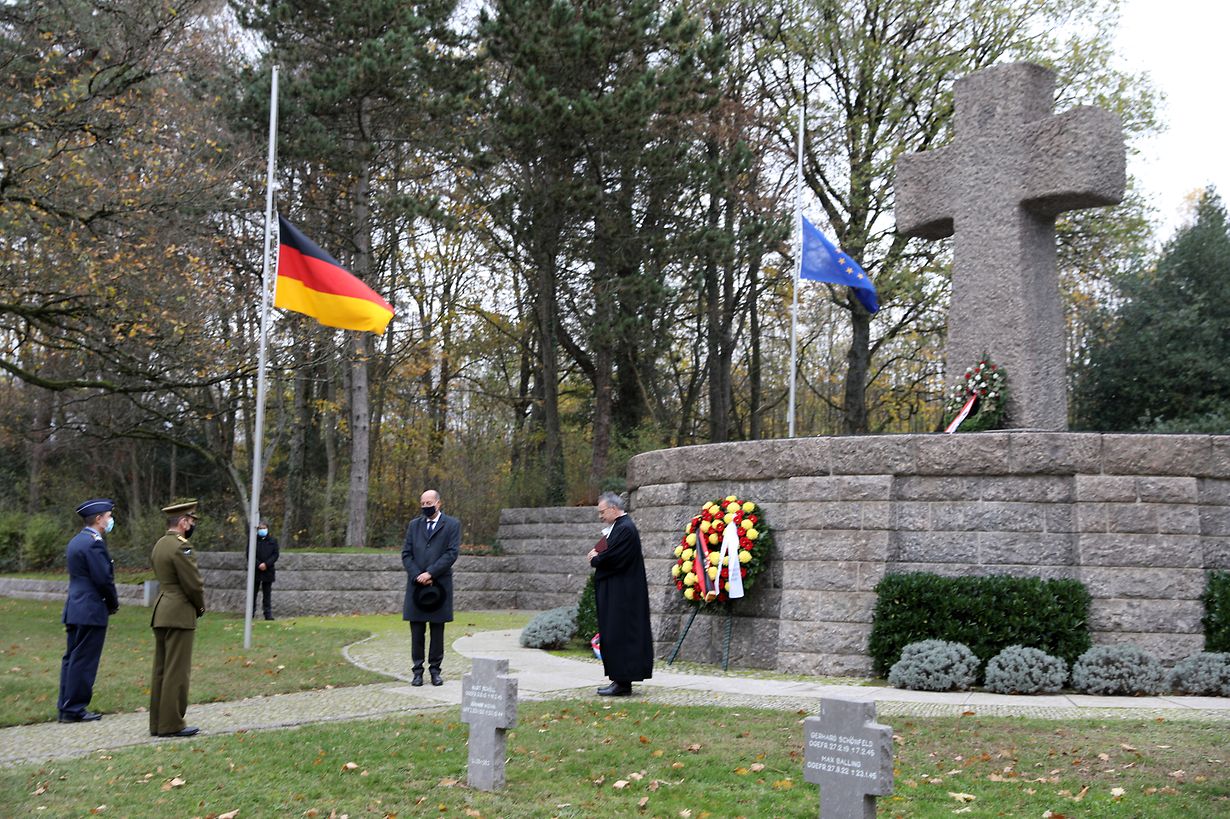 Sandweiler: Aufgrund der aktuellen Entwicklung rund um die Corona-Pandemie wurde dieses Jahr die Gedenkveranstaltung auf dem deutschen Soldatenfriedhof in Sandweiler nicht wie gewohnt begangen. Die Gesundheit der Teilnehmenden war das vorrangige Anliegen, trotzdem sollte dieser wichtige Tag des Erinnerns und Gedenkens der Opfer der beiden Weltkriege sowie der aktuellen Kriegshandlungen würdig begangen werden. Die Deutsche Botschaft in Luxemburg und der Volksbund Deutsche Kriegsgräberfürsorge hatten am Sonntag zusammen mit der katholischen und evangelischen Gemeinde in deutscher Sprache zu einer Kranzniederlegung mit einem festgelegten Personenkreis eingeladen. In Sandweiler ruhen insgesamt 10.913 deutsche Soldaten, die bei den schweren Kämpfen im Winter/Frühjahr 1944/45 in Luxemburg und den Grenzgebieten ums Leben kamen.