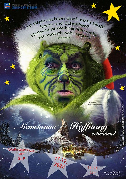 Am Samstag, dem 17. Dezember 2022, findet unsere diesjährige Schulweihnachtsfeier unter dem Motto „Hoffnung schenken“ in der Zeit von 14.00 bis 18.00 Uhr als Weihnachtsmarkt auf dem Innenhof des Schengen-Lyzeums statt. Dazu sind alle Schülerinnen und Schüler, Eltern und Angehörige, Ehemalige und die interessierte Öffentlichkeit herzlich eingeladen.
