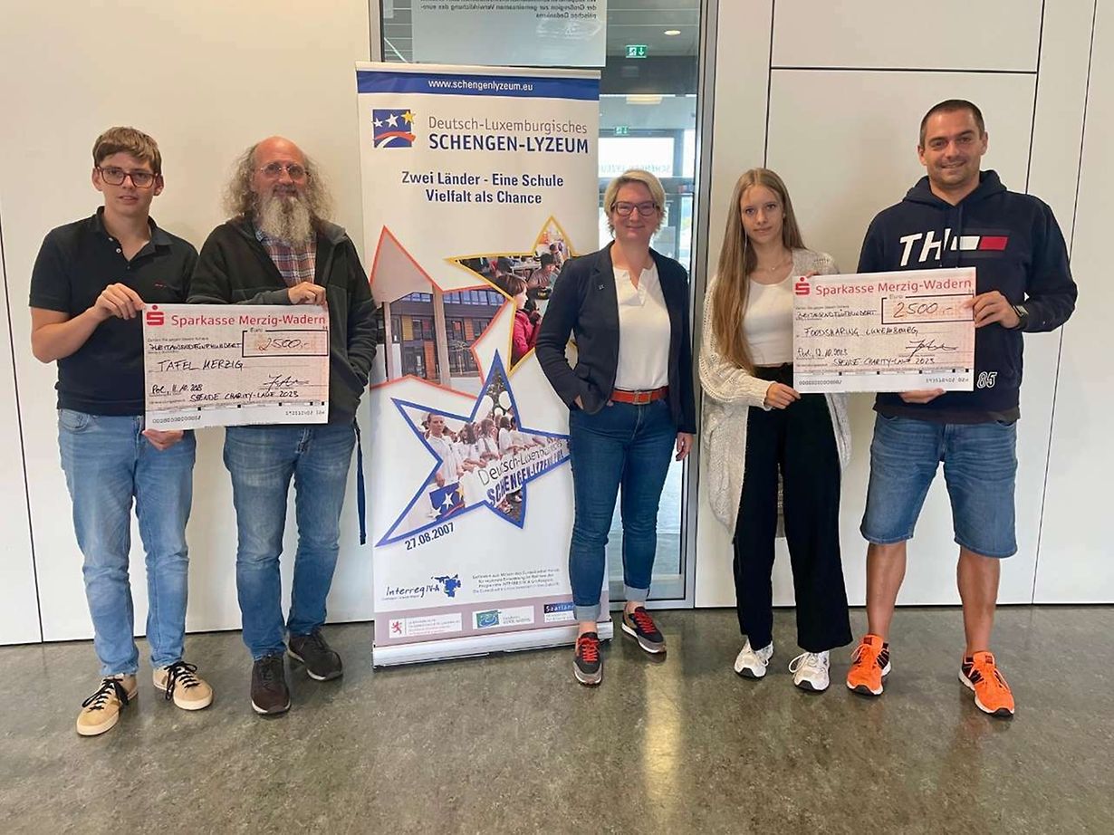 Am Donnerstag, dem 12. Oktober überreichten die Schülervertreter*in Julia Burel und Raphael Rouby zusammen mit der Schulleiterin Frau Zenner die Spendenerlöse in Höhe von insgesamt 5000,- Euro an Herrn Paquet von der Tafel Merzig und Herrn Torres von Foodsharing Luxembourg a.s.b.l.