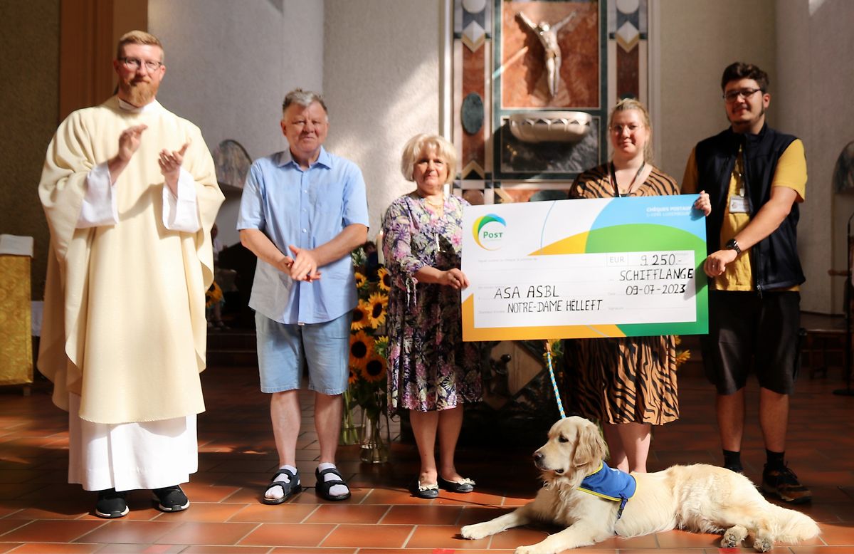 Es war gleichzeitig der Abschluss des Pastoraljahres und galt ebenfalls als Danksagungsmesse der Kommunionskinder zum Ende des Schuljahres. Zugleich war es der Abschluss des sozialen Pastoralprojektes zu Gunsten der Vereinigung „Amicale vun der Schoul vun den Assistenzhonn (ASA)“. In diesem Sinne konnten die Vertreter dieser Vereinigung in der Begleitung von Assistenzhund „Sanny“ eine Geldspende in Höhe von 9750 Euro in Empfang nehmen. Die gesammelten Gelder stammen aus Aktivitäten von Vereinen, Kollekten und Spenden. Die ASA finanziert die Ausbildung von Assistenzhunden, u.a. zur Unterstützung von Menschen mit epileptischen Anfällen oder etwa zu einer sozialen betreuenden Begleitung. Eine wichtige Einnahmequelle ist das Sammeln von Verschlüssen aus weichem Plastik nach dem Motto „e Stopp fir de Mupp“. Seit 2011 hat die Vereinigung die Ausbildung von zehn Assistenzhunden finanziert. Gleichzeitig kommen diese Sammelaktionen ebenfalls der Umwelt zugute.