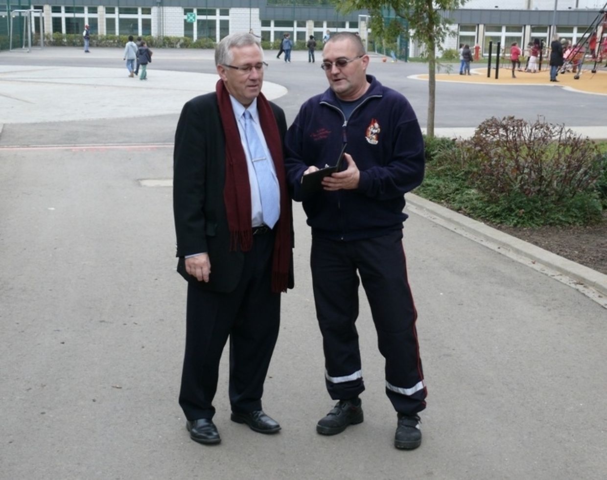 Kommandant Roby Berkes gab Bürgermeister Roland Schreiner und Schöffe Paul Weimerskirch während der gesamten Übung fachmännische Erklärungen zum Ablauf des Geschehens und gab weitere Anregungen zur Verbesserung der Sicherheit der Schüler und des gesamten Personals.