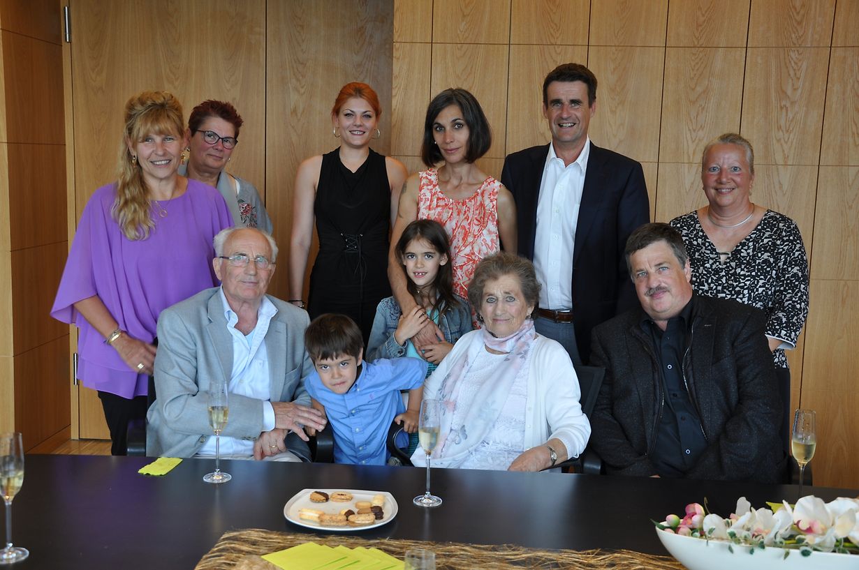 Schouweiler : Am 24. Mai 1958 heirateten Ernest Wesquet und Mariette Weynandt in Hollerich und konnten somit dieses Jahr im Kreise der Familie ihre Diamantene Hochzeit in der Gemeinde Dippach feiern, wo sie seit 1964 ansässig sind. Die Gemeindeverwaltung, zusammen mit den Vertretern der intergenerationellen Kommission hatte das diamantene Brautpaar mit ihren beiden Söhnen und deren Familie zu einer kleinen Feier eingeladen. Nachdem Bürgermeisterin Manon Bei-Roller einen kurzen Lebenslauf der Eheleute vorgetragen hatte, wurden ihnen Geschenke und Blumen überreicht.