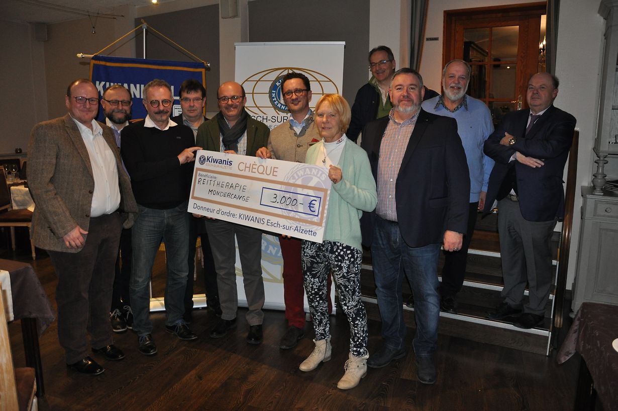 Kürzlich überreichten die Verantwortlichen des Service-Club Kiwanis aus Esch-sur-Alzette in der Osteria del Ponte in Schouweiler einen Scheck über den Betrag von 3.000 Euro an die Association Thérapie Equestre (A.T.E.) aus Mondercange. Christiane Betz-Koch, Hippotherapeutin und Sekretärin von A.T.E. erklärte den anwesenden Kiwanis-Mitgliedern das Prinzip der Hippotherapie, welches aus einer ärztlich empfohlenen und überwachten Einzelbehandlung auf dem Pferd besteht. Der Patient kann somit die dreidimensionalen Bewegungen des Pferderückens bestmöglich aufnehmen. Ziele der Therapie sind die Entspannung und Tonusregulierung der Muskulatur sowie die Schulung von Koordiantion und Gleichgewicht. Georges Carbon, diesjähriger Präsident des Kiwanis Esch bedankte sich herzlich bei der Vertreterin von A.T.E. und unterstrich die Notwendigkeit solcher Spenden. Der Abend endete mit einem Essen sowie angeregten Diskussionen.