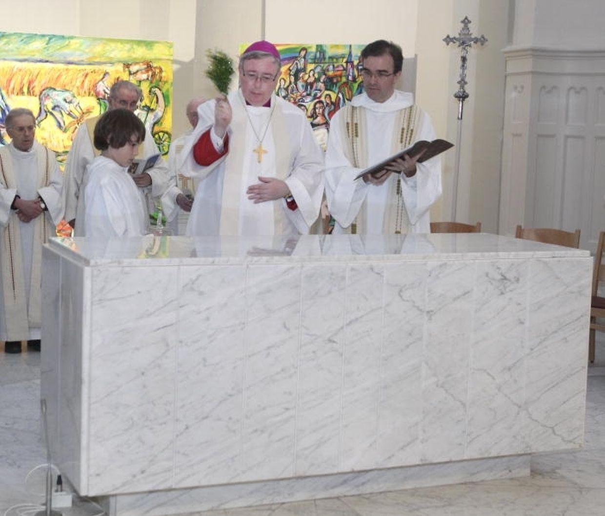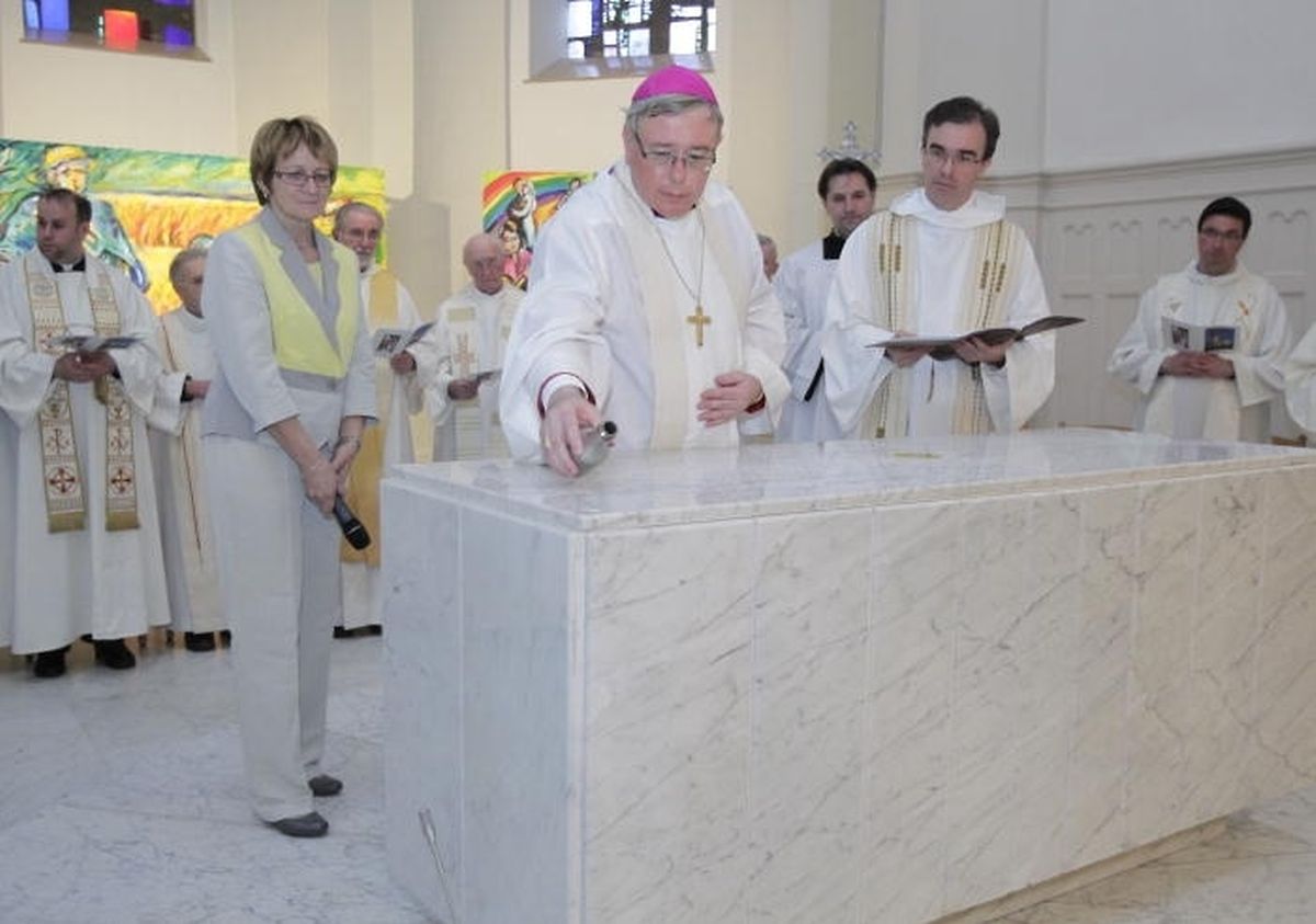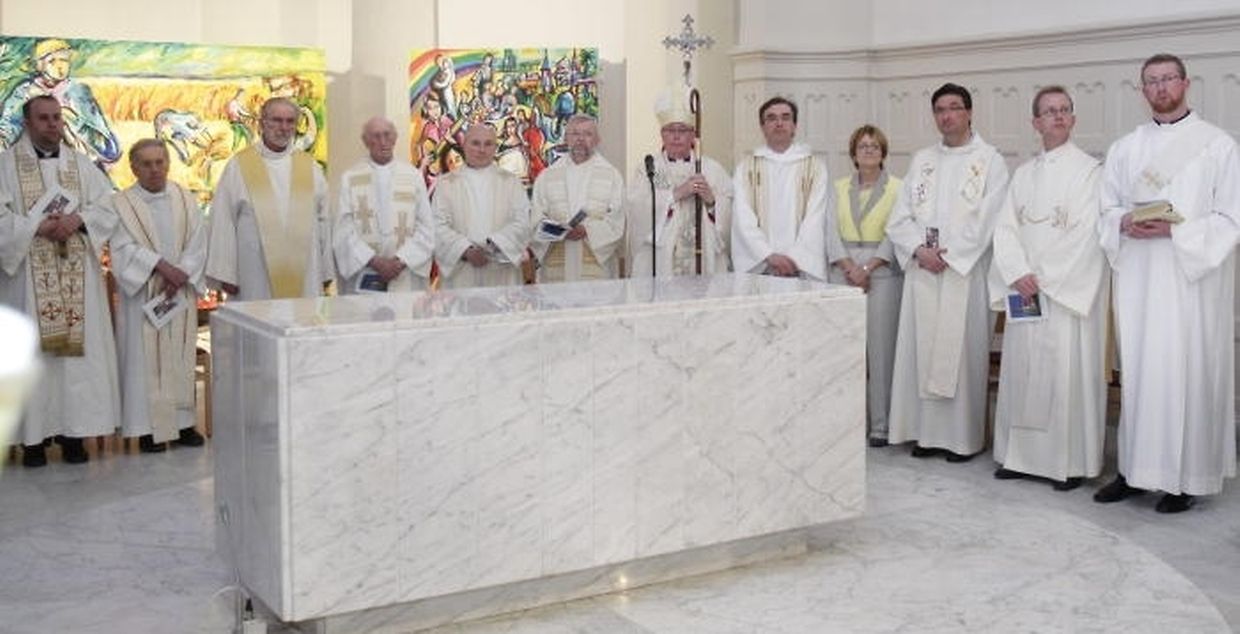 Seitens der Mitglieder des Pastoralteams wurde mehrmals auf jene lebendige christliche Gemeinschaft gepocht, die auch der Erzbischof in seiner Predigt thematisierte. „Wir sind Kirche, und Jesus will, dass die Steine lebendig sind“, so der Oberhirte, der eine lebendige, ausstrahlende Kirche, „die radikal im Dienst der Menschen steht“, forderte und zudem unterstrich: „Lebendige Gemeinschaften sind in unseren Pfarreien und Pfarrverbänden von absoluter Notwendigkeit.“ Mit den Worten „Mache diesen Altar zu einem Ort, an dem sich die Geheimnisse unserer Erlösung vollziehen“, leitete der Erzbischof die anschließende Altarkonsekration ein, zu der u. a. die Salbung des Altars mit Chrisam, das Verbrennen von Weihrauch und das Weihegebet gehören. Die Mitglieder des Pastoralteams deckten den Altar zur anschließenden Eucharistiefeier, für die Jean-Claude Hollerich von den Geistlichen Nico Schartz, Georges Hellinghausen, Leo Wagener, Ferdy Fischer, Robert Brosius, Maurice Blanche, Claude Bache, Francis Erasmy und Luc Schreiner umgeben war und bei der Diakon Charles Bremer Dienst am Altar leistete.