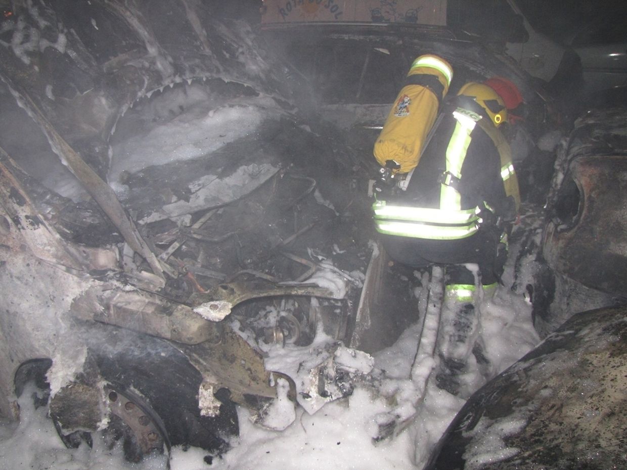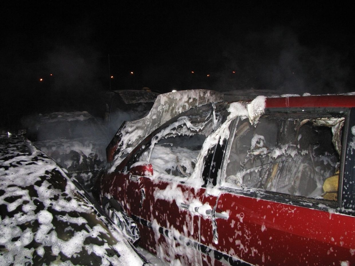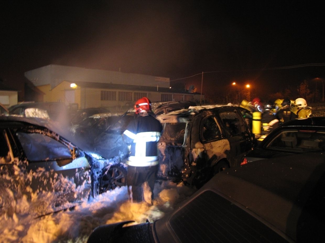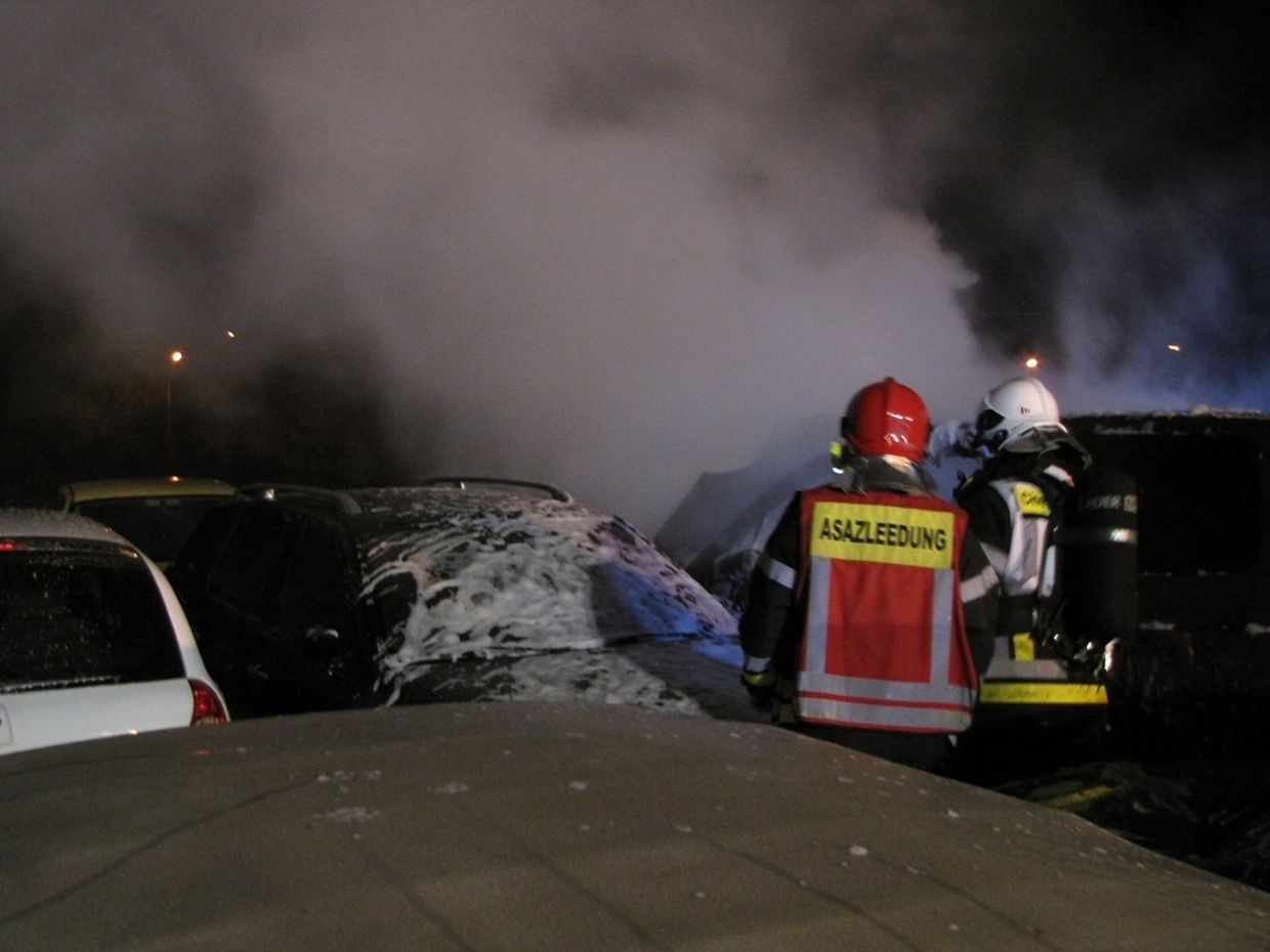 Einige Augenblicke später trafen die ersten Einsatzkräfte ein und standen tatsächlich einem ausgedehntem PKW Brand gegenüber. 4 Fahrzeuge standen bereits in Vollbrand. Trotz dem schnellen Eingreifen mehrerer Atemschutztrupps, welche die Flammen mit Löschschaum niederkämpften, wurden noch 4 weitere Fahrzeuge, welche alle sehr eng beieinander standen, durch die große Hitzeauswirkung schwer beschädigt. Verletzt wurde bei dem Brand niemand.