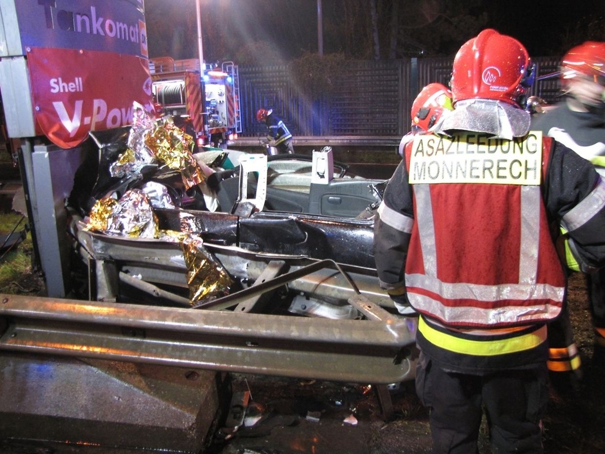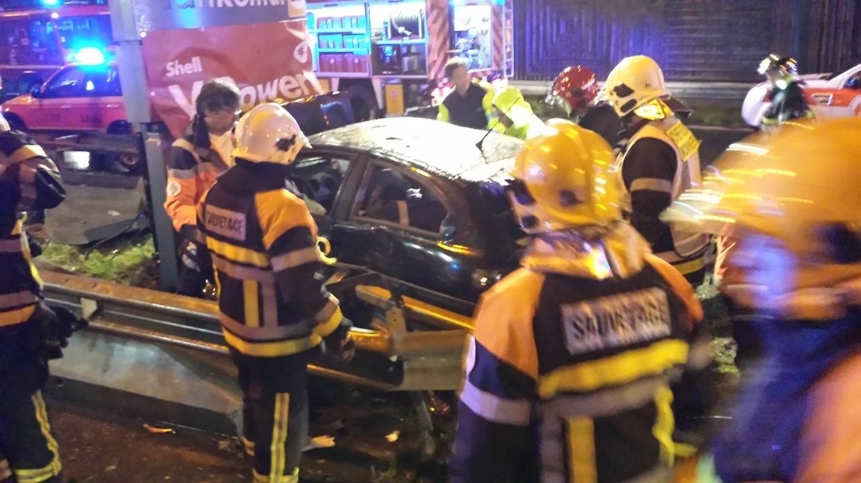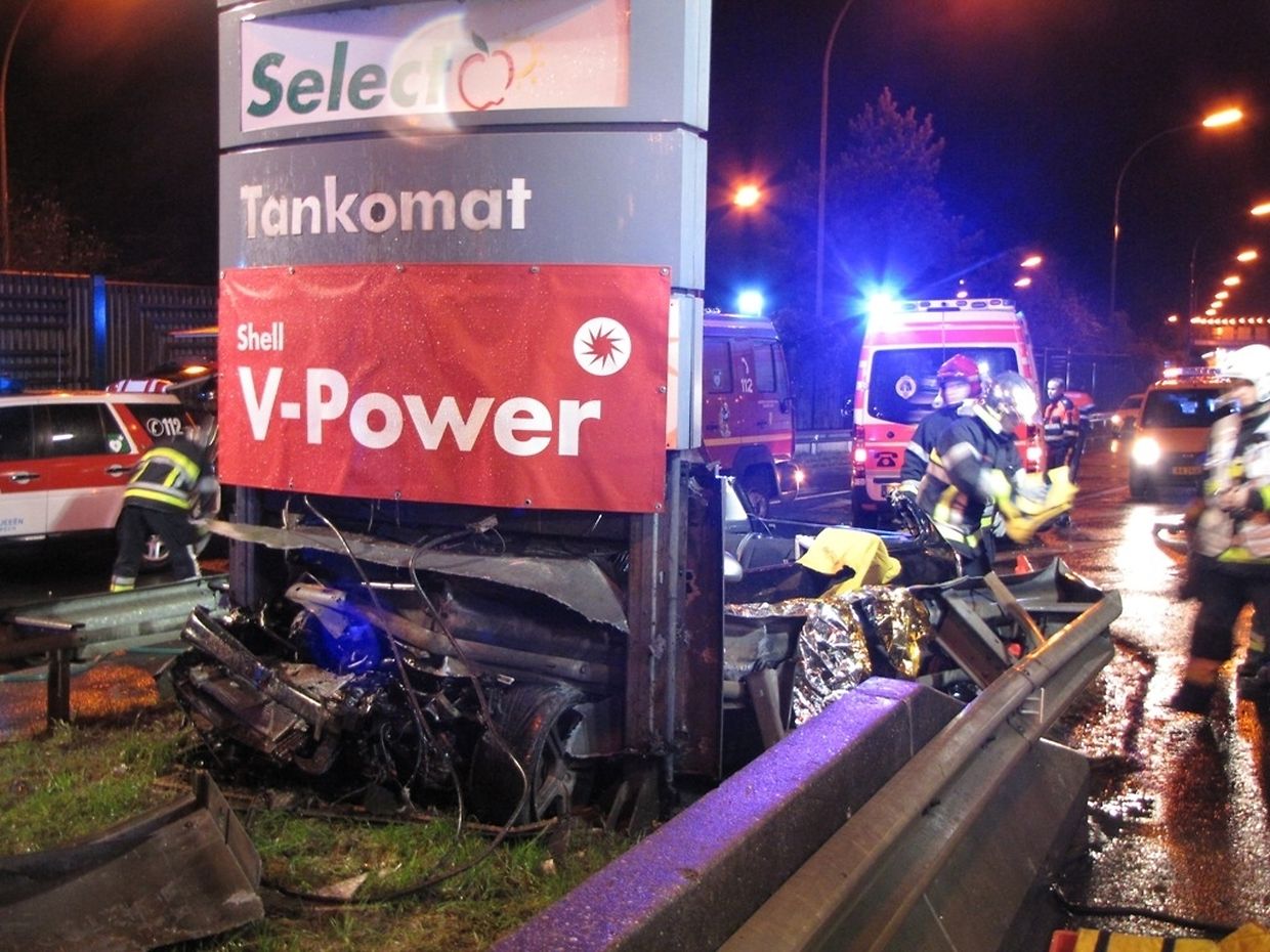 Schwer verletzt wurde eine Person kurz nach Mitternacht als dieser frontal mit seinem PKW in ein Schild einer Autobahntankstelle prallte.