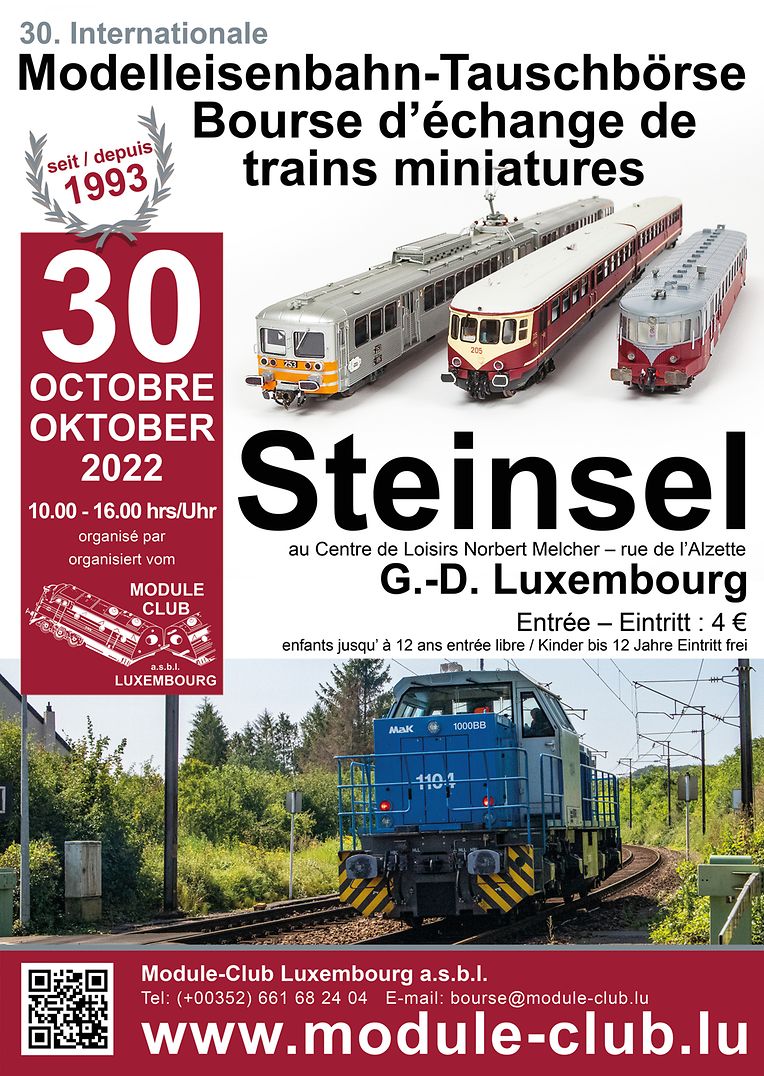 Am 30. Oktober 2022 findet die 30. Internationale Modelleisenbahn Tauschbörse statt, von 10 bis 16 Uhr ist geöffnet. Der Eintritt kostet nur 4 Euro und ist für Kinder unter 12 Jahren sowie für Club-Mitglieder frei. Der Module-Club Luxembourg a.s.b.l. organisiert traditionell immer am letzten Sonntag im Oktober die über die Grenzen hinaus bekannte internationale Modelleisenbahn Tauschbörse in Steinsel.