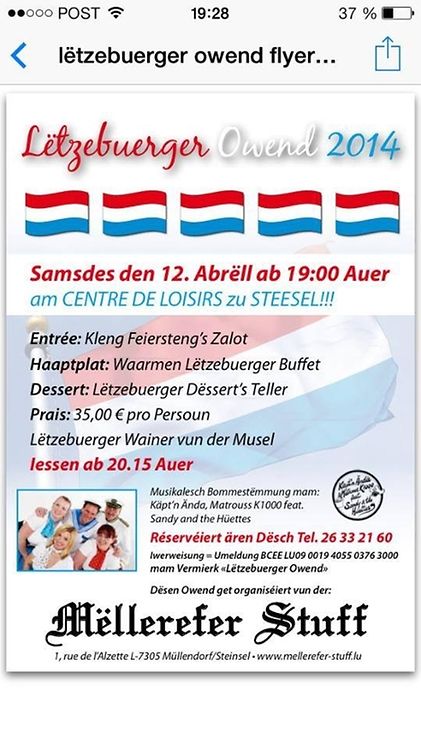 Lëtzebuerger Owend déi 3. heescht et Samsdes den 12. Abrëll 2014 am Centre de Loisirs Norbert Melcher zu Steesel.