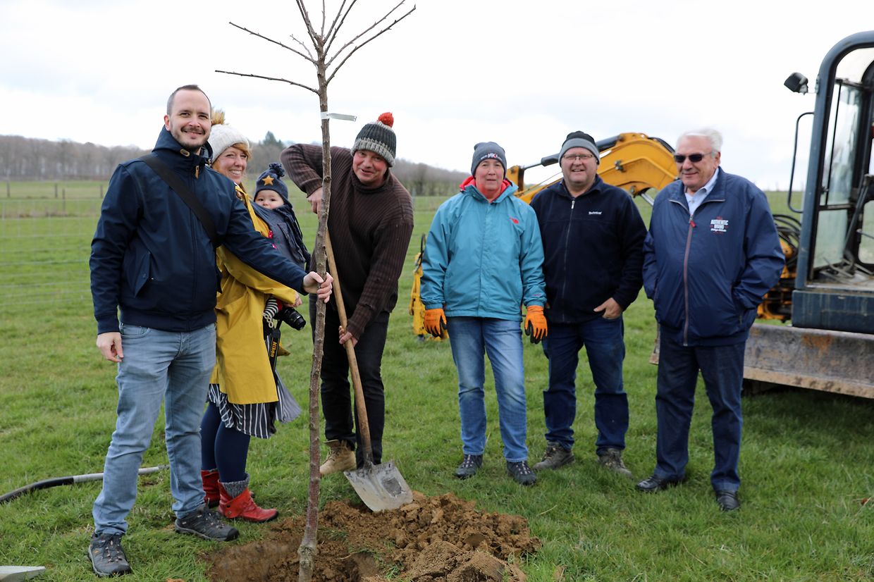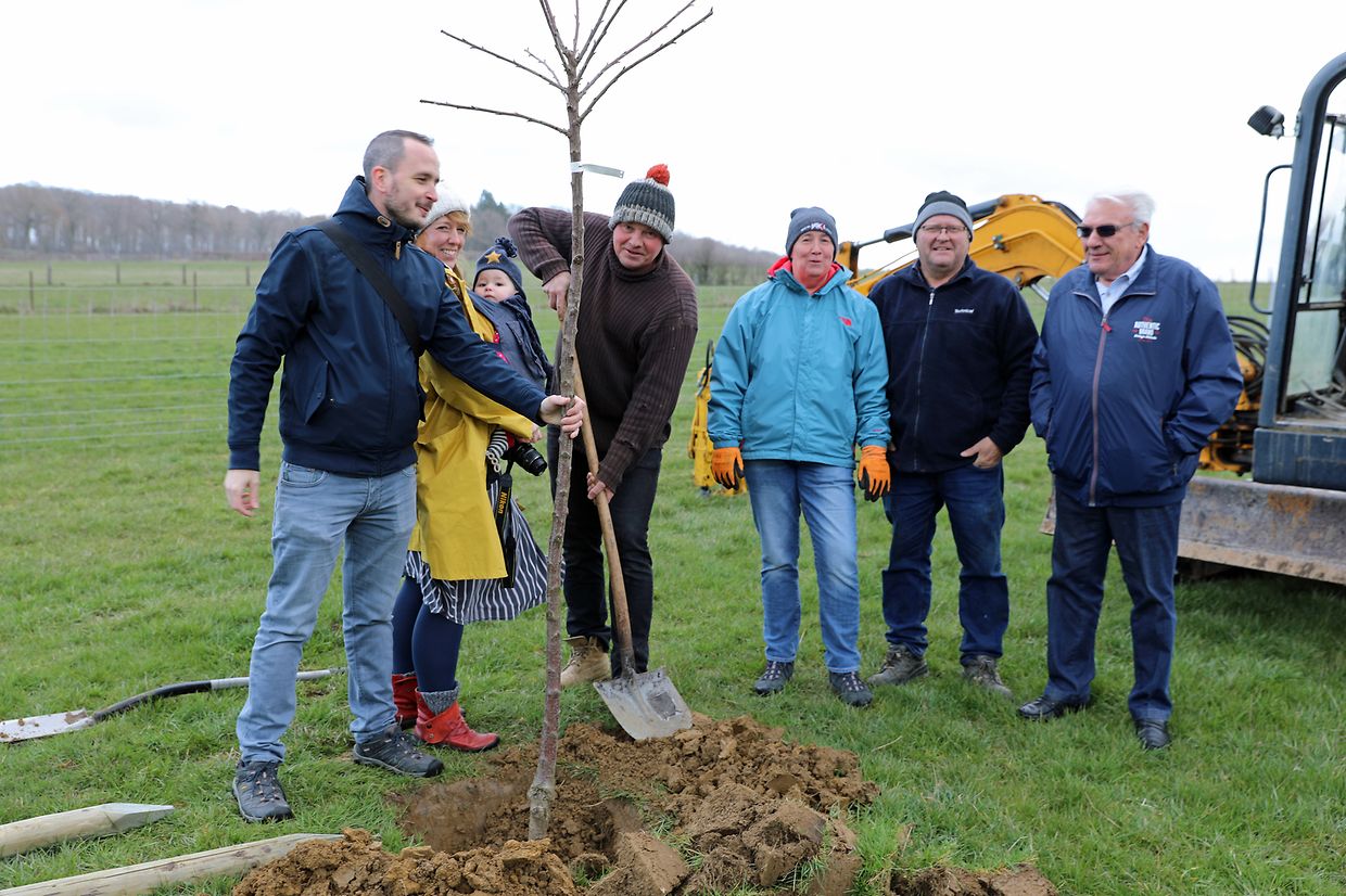 Am 26. März feiert die kleine Ella-Sophia ihren ersten Geburtstag. Ihre Eltern Peggy und Alex Bertrand-Thill wollten dazu ein sichtbares Zeichen von unverwechselbarem lebendigem Wert setzen. Mutter und Vater sagen sich sehr naturverbunden und deshalb schien ein Obstbaum als ausdrucksstarkes Geschenk ideal. Der Baum sollte kein Exot sein, sondern ein „wohlvertrauter Nachbar“, der nachhaltig und ökologisch einen bleibenden Eindruck vermittelt. Am 25. März wurde ein Hochstammbaum von Spezialist Joël Adam im neu angelegten Bongert von Monique Gudenkauf im Ort genannt „Ueleschter“ in Tüntingen fachgerecht in die Erde gesetzt. Ausgewählt hatten die Eltern einen Schwarzkirschbaum (prunus avium bigarreau), denn Kinder lieben Kirschen. Was gibt es wohl Schöneres, als in fünf sechs Jahren die dunkelroten Früchte vom eigenen Baum zu naschen. Kein Wunder, dass die rote Kirsche für Glück und Lebensfreude steht und als Symbol für Schönheit und Reinheit gilt. Die Anwesenden wünschten der kleinen Erdenbürgerin, dass sie so groß und stark wie ihr Kirschbaum werde.