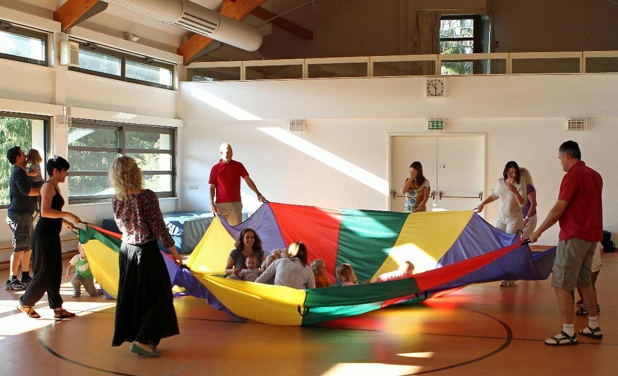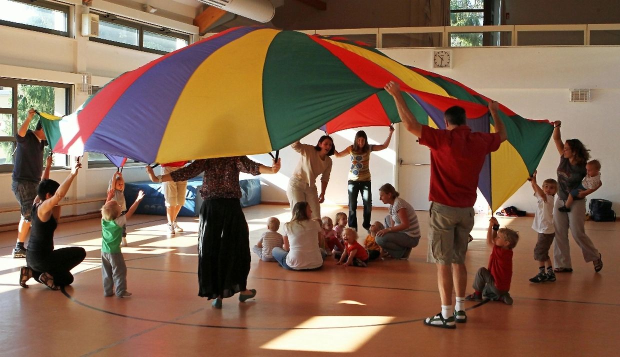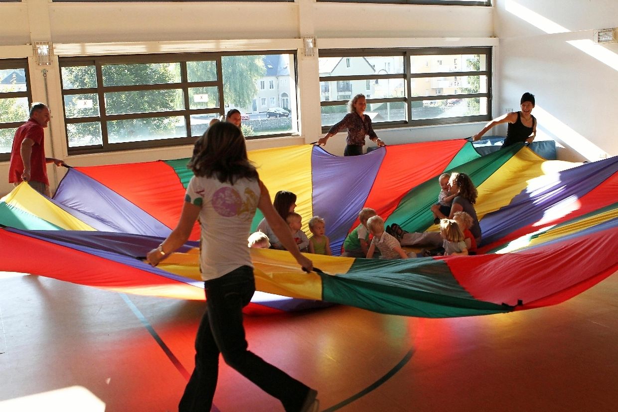 Ënnert der Leedung vun Sophie Gidt, Myriam Schroeder an Pia Kockelmann kennen Kanner mat vill Freed a Spaass ob engem extra vir si opgeriichten Parcours Trampolin sprangen, iwwert Turnbänken rutschen, duerch en Tunnel krauchen an nach villes aneres maachen.