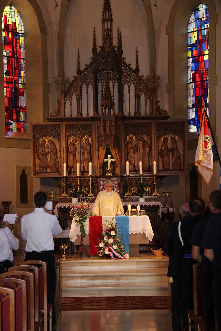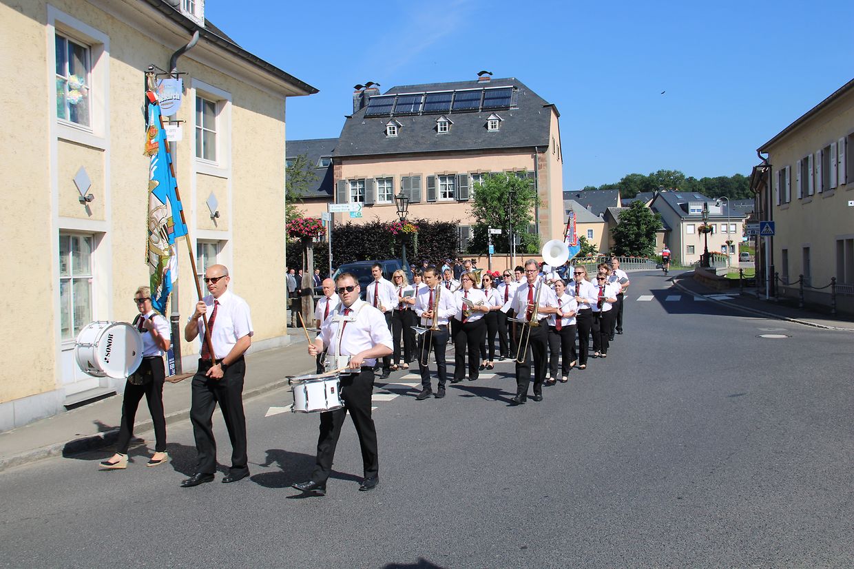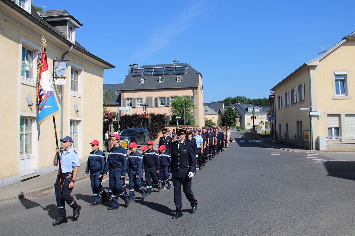 De Cortège fir an d’Kierch, ugefouert vun der Harmonie Useldeng an de Pompjeeën aus der Gemeng goung um 10.15 Auer am Millenhaff zu Useldeng fort.