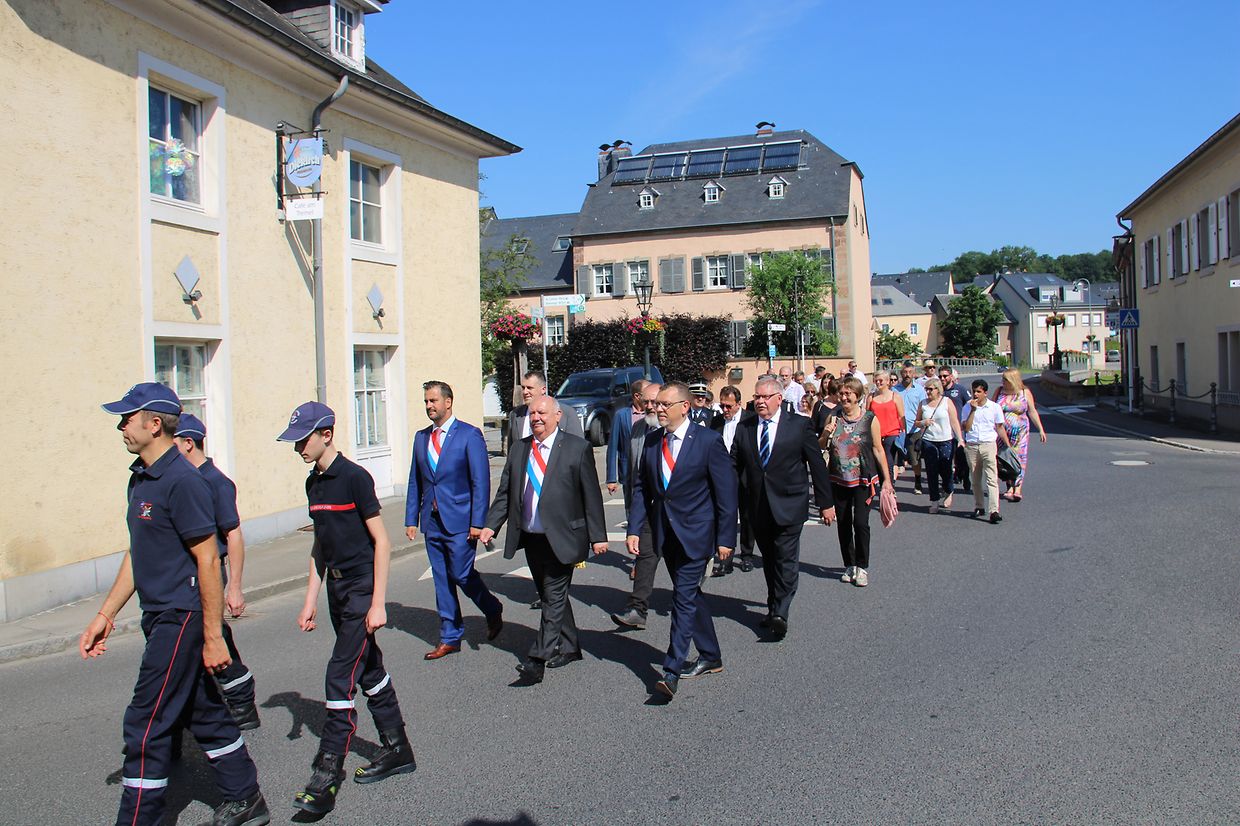 Deemno huet no dem offiziellen Deel de Cortège op de Fussballterrain gefouert, wou dunn den uschléissenden Éierewäin dëst Joer eng éischte Kéier op der „place de rencontre“ um neie Fussballterrain zerwéiert gouf.