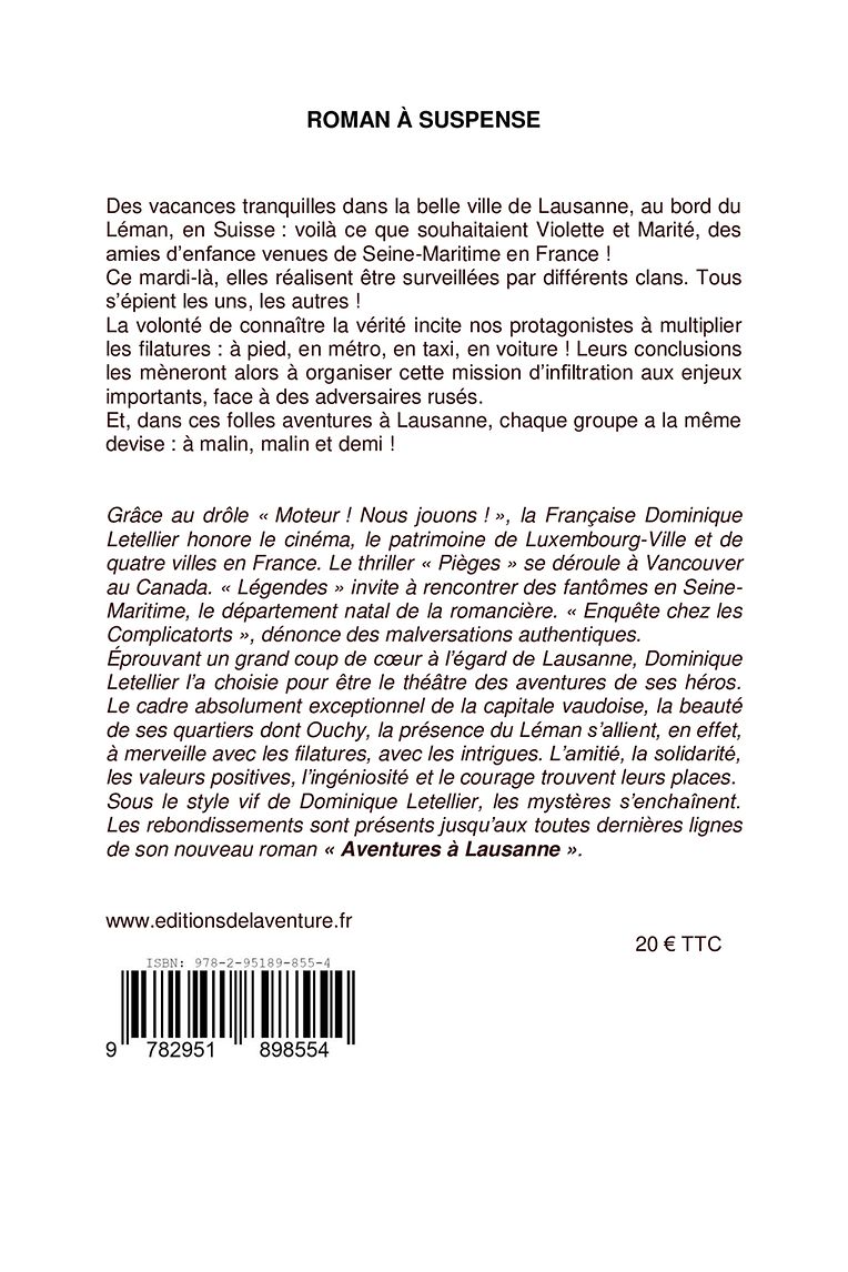 Dans « Aventures à Lausanne », ses héros n’auraient jamais dû se rencontrer ! De filatures en filatures, ils orchestreront au bord du Léman une mission d’infiltration. Sans recourir à la violence, Dominique Letellier a su multiplier les énigmes, créer une ambiance. Avec justesse, elle analyse notre société, mettant en garde qui de droit contre certaines malversations précises. Les rebondissements sont nombreux, avec un final qui stupéfie ses protagonistes, ses lecteurs !