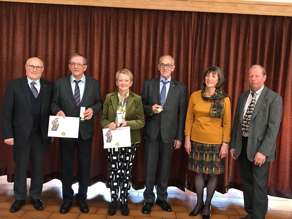 Das Fest der Schutzpatronin der Sänger und Sängerinnen feierte die Chorale Ste-Cécile Walferdange am 17.+18.11.2018 während der beiden Gottesdienste mit mehrstimmigem Chorgesang, u.a. einer zeitgenössischen Festmesse von Lorenz Maierhofer. Pfarrer Léon Wagener dankte dem Chor und seiner Dirigentin Elisabeth Schmit, den Organisten Roger Goodwyn und Jemp Kinn und den Vorsängerinnen für ihr zuverlässiges musikalisches Mitgestalten der zahlreichen Gottesdienste. Zum gemeinsamen Mitagessen am Sonntag begrüsste Präsident Jos Turmes die Sängerinnen und Sänger mit ihren Familien und einige freiwillige Helfer des Vereins. Er erinnerte an die verstorbenen Mitglieder und Angehörigen. Geschenke wurden, als Anerkennung für ihre besonderen Aufgaben, der Dirigentin, den Organisten und dem Archivar Michel Langue überreicht. Pfarrer Léon Wagener erhielt eine Überraschung zum 30. Jahrestag seiner Primizfeier. Medaillen der Union Saint Pie X wurden zur Ehrung für ihre musikalische Tätigkeit überreicht: für 30 Jahre die «médaille en or» an Maisy Wagner, für 40 Jahre die «médaille en or avec palmettes» an Pierre Kummer und Jean Welbes.