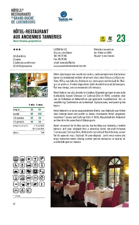 Eines der vorgestellten Hotels ist das Hotel Anciennes Tanneries aus Wiltz, welches auch auf einer ganzen Seite mit Foto, Ausstattungsdetails und Kontaktdetails gelistet ist.